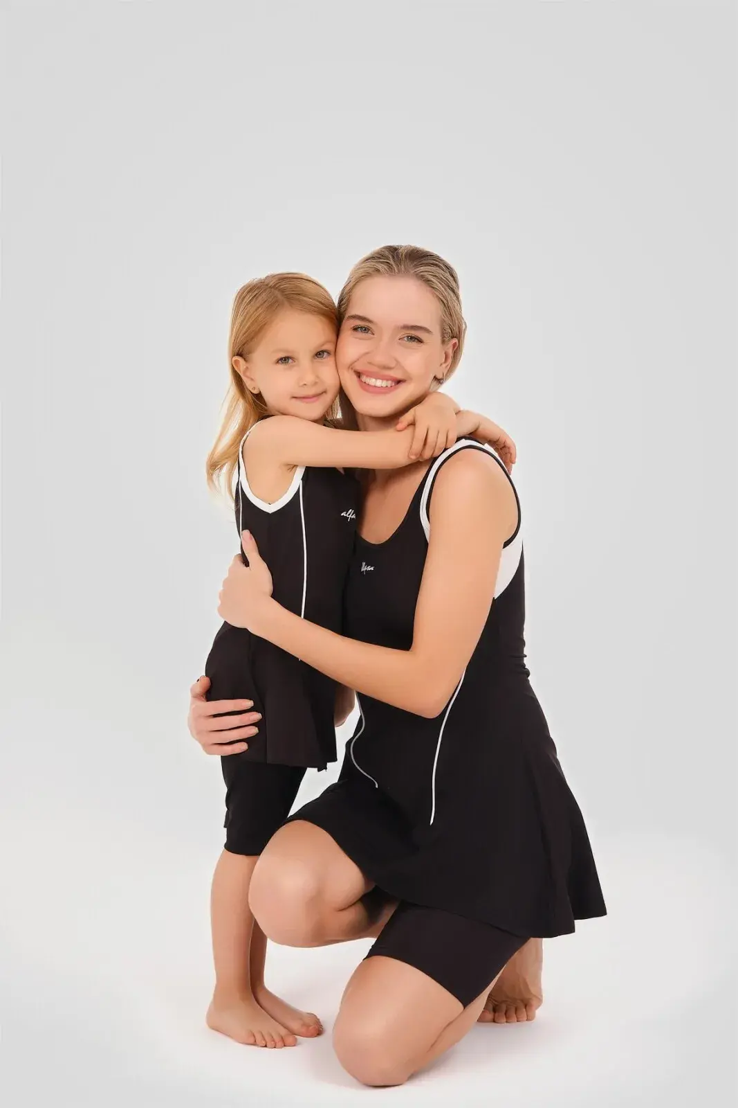 Alfasa Tenis Baskı Süslemeli Sıfır Kol Şort Taytlı Kız Çocuk Mayo 24105 Siyah