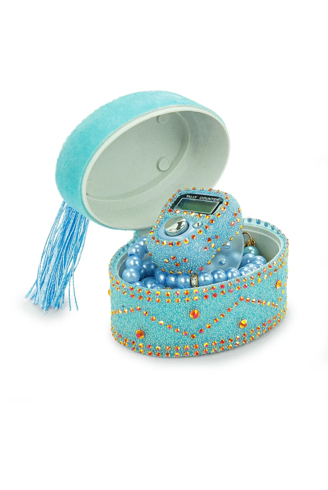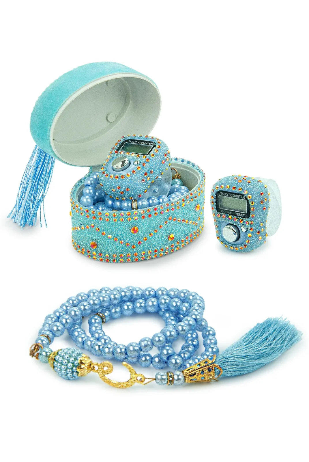 Allah Lafızlı Taş Süslemeli Püsküllü Kutulu Zikirmatik ve İnci Tesbihli Mevlüt Hediye Seti Mavi