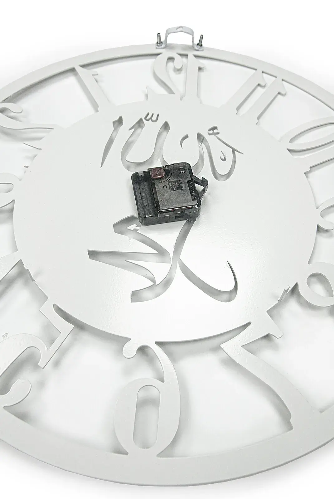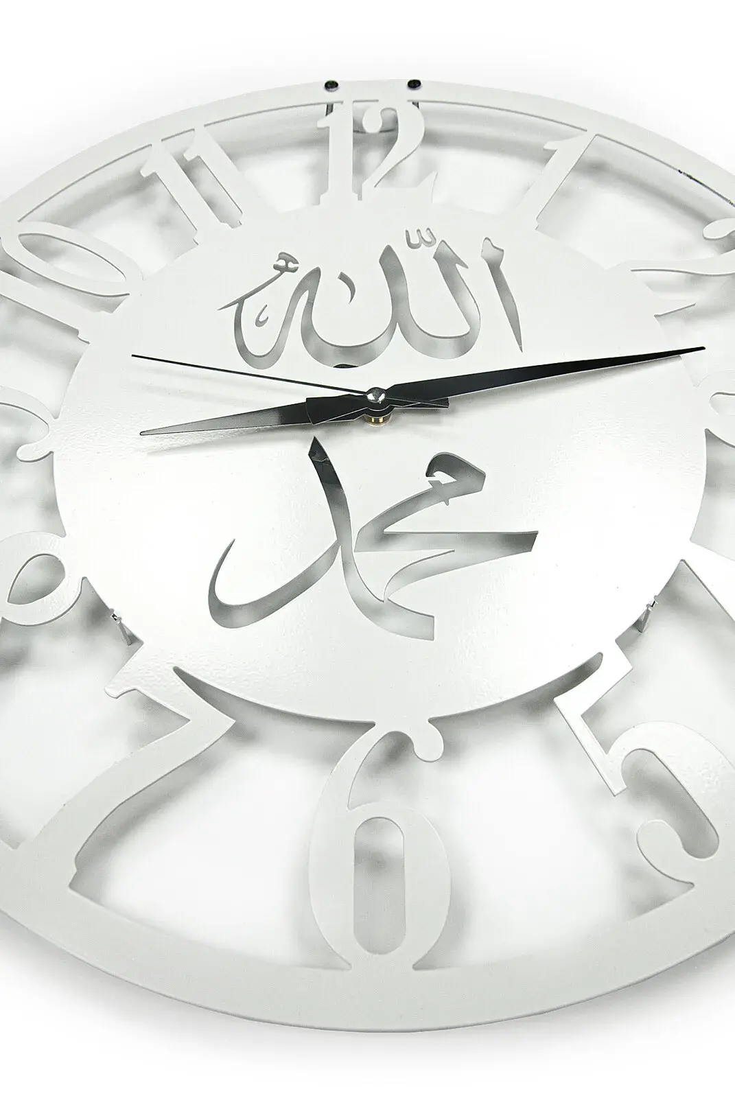 Saatimiz, 48x48 cm boyutlarında ve 1340 gram ağırlığında olan, duvara asılarak kullanılabilen bir metal duvar saati olarak tasarlanmıştır. Üzerinde "Allah ve Muhammed" lafızları bulunmaktadır. Saatin gövdesi döküm kaplama ile işlenmiştir, bu da ürüne dayanıklılık kazandırır ve uzun ömürlü kullanım sağlar.