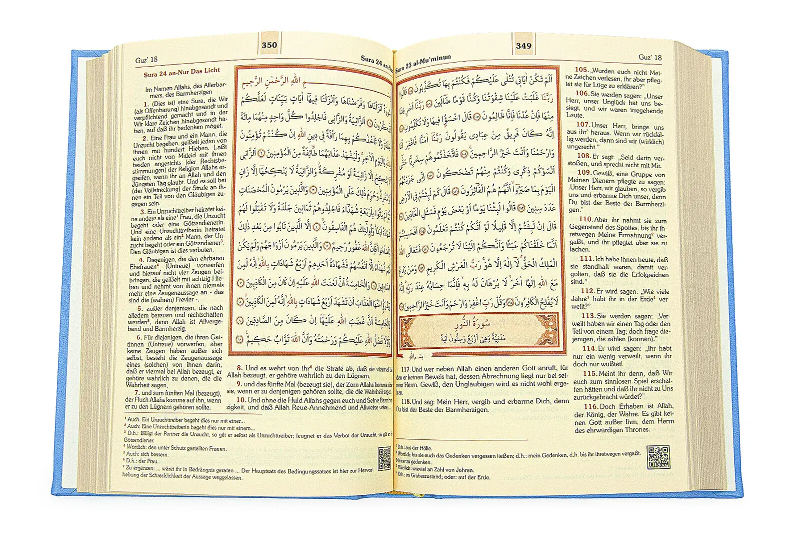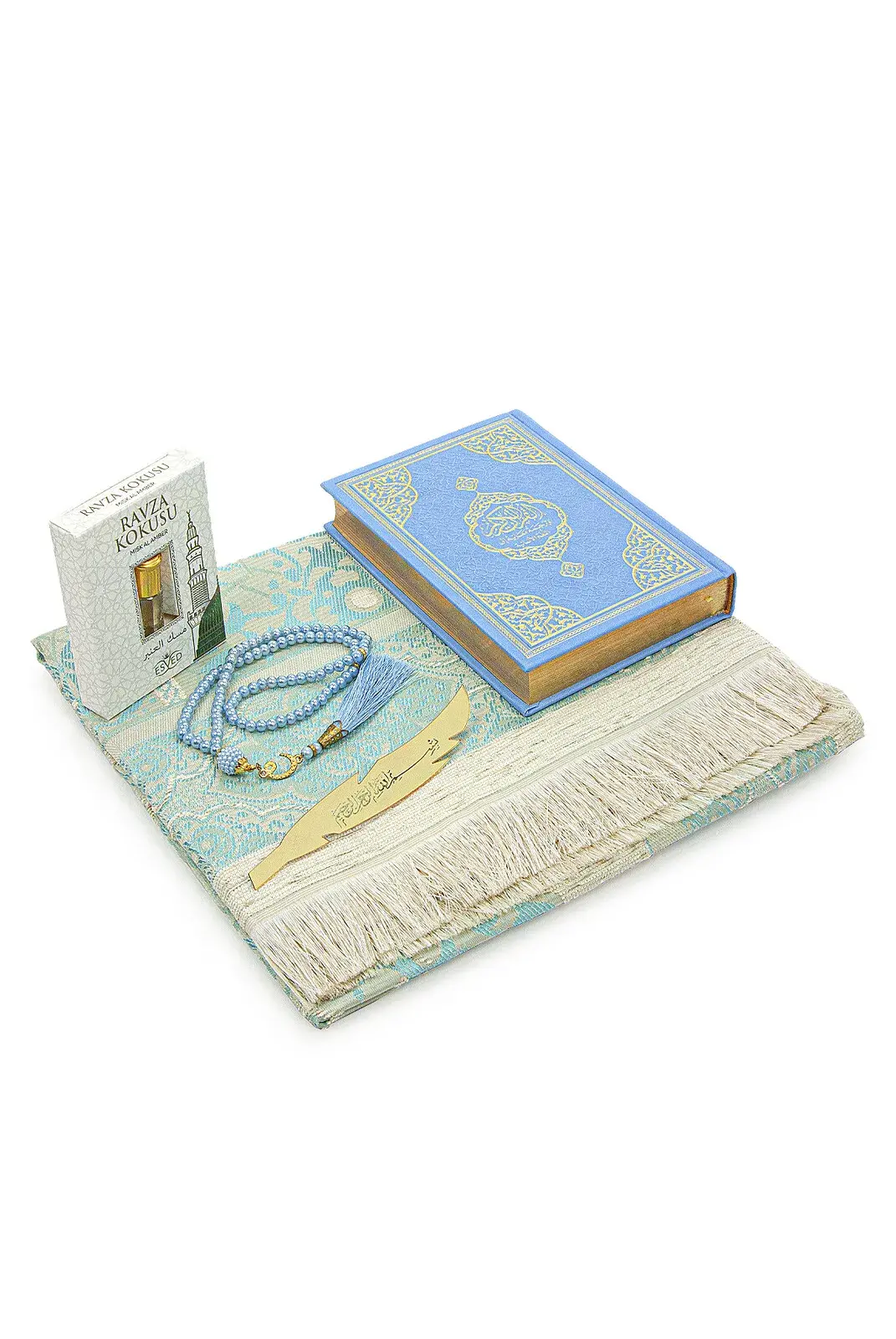 Almanca Mealli Medine Hatlı Kuranı Kerim ve Seccade Seti Mavi