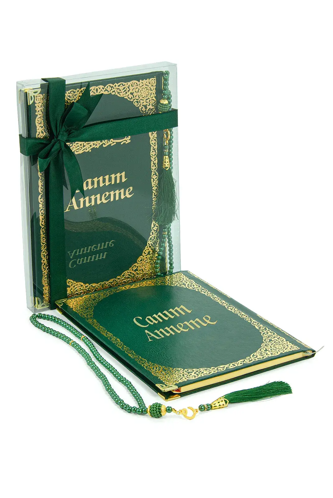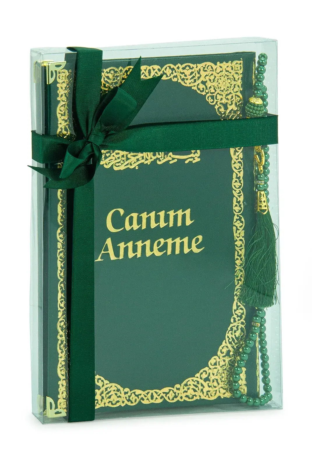 Anneler Günü için özenle hazırlanan bu şık set, annenize olan sevginizi ifade etmenin zarif bir yoludur. “Canım Anneme” baskılı deri ciltli Yasin kitabı, altın yaldızlı detaylarıyla dikkat çeker. 99’lu inci görünümlü tesbih ile uyum içinde tasarlanan set, kurdeleyle süslenmiş şeffaf hediye kutusunda sunulur. Hem göze hitap eden hem de anlamlı bir hediye seçeneği olarak öne çıkar.