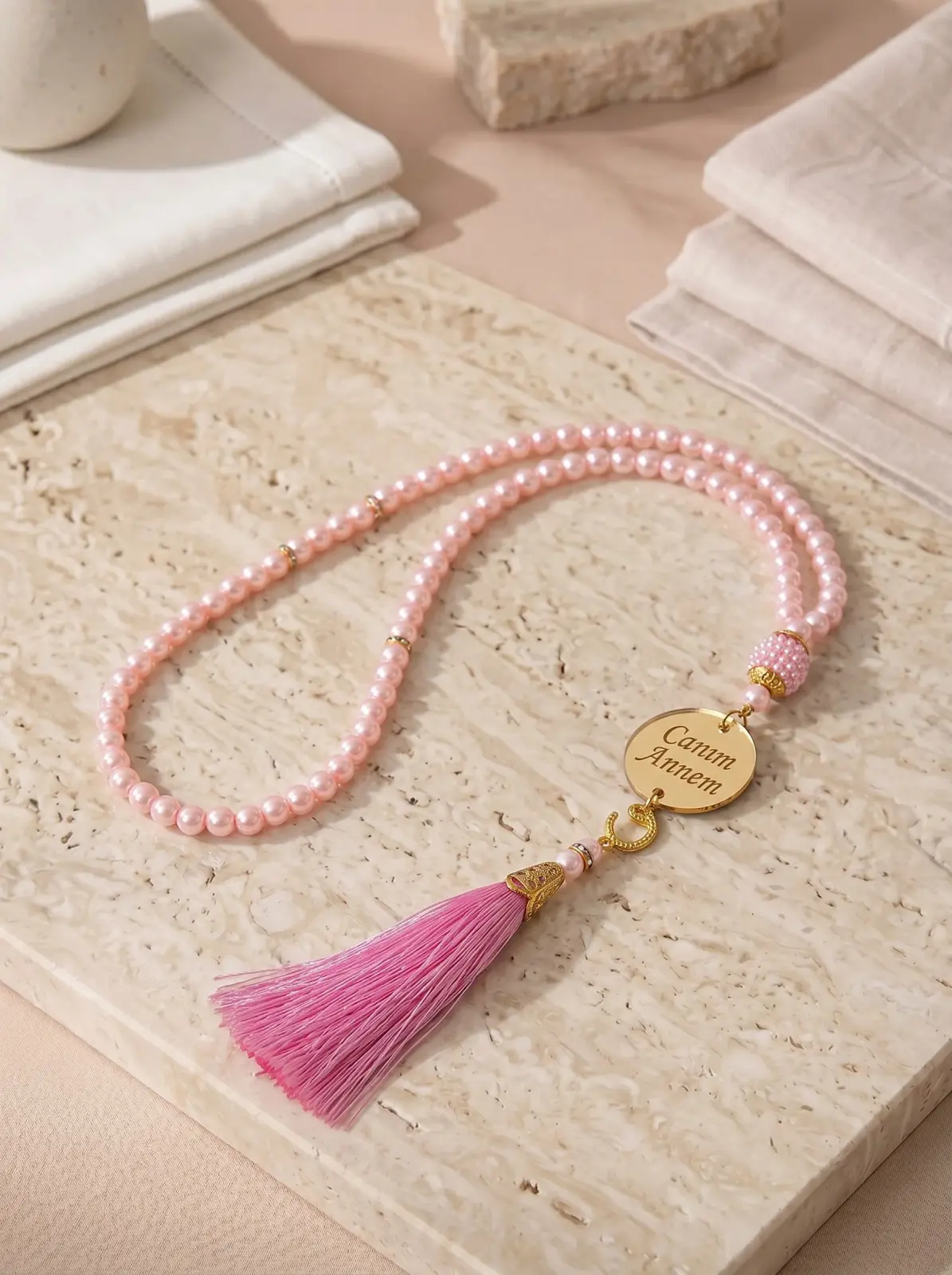 - Tesbih: İnci görünümlü boncuklar, püsküllü ve "Canım Annem" yazılı pleksi plaka