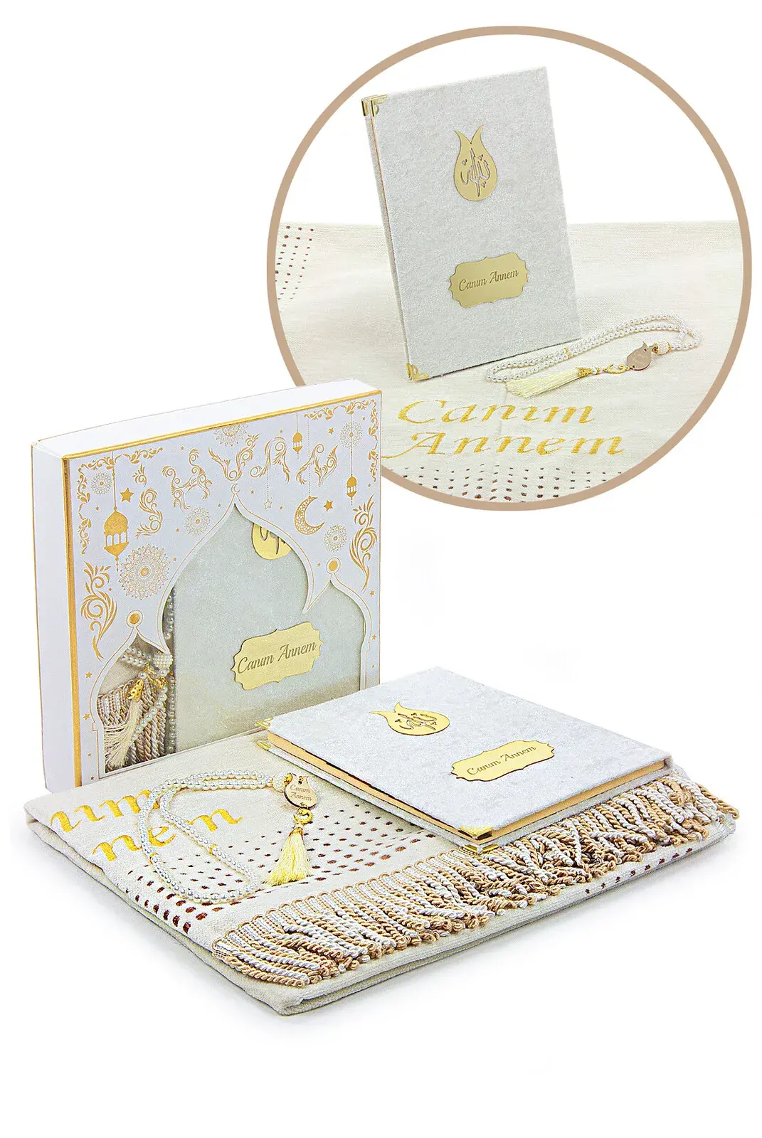 Bu özel set, inci görünümlü tesbih, Yasin kitabı ve isme özel detay ve nakışlarıyla kişiselleştirilebilen seccade setini bir araya getiriyor. Annenize özel ve anlamlı bir armağan olacak. Annenizi mutlu etmek ve ona unutulmaz bir hediye vermek için bu özel seti tercih edebilirsiniz.