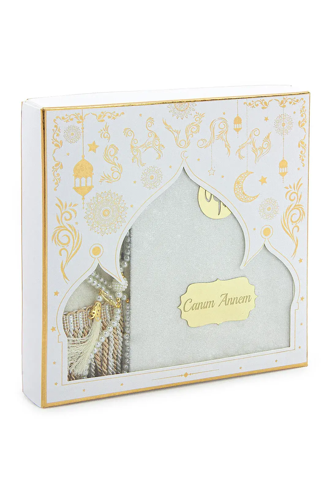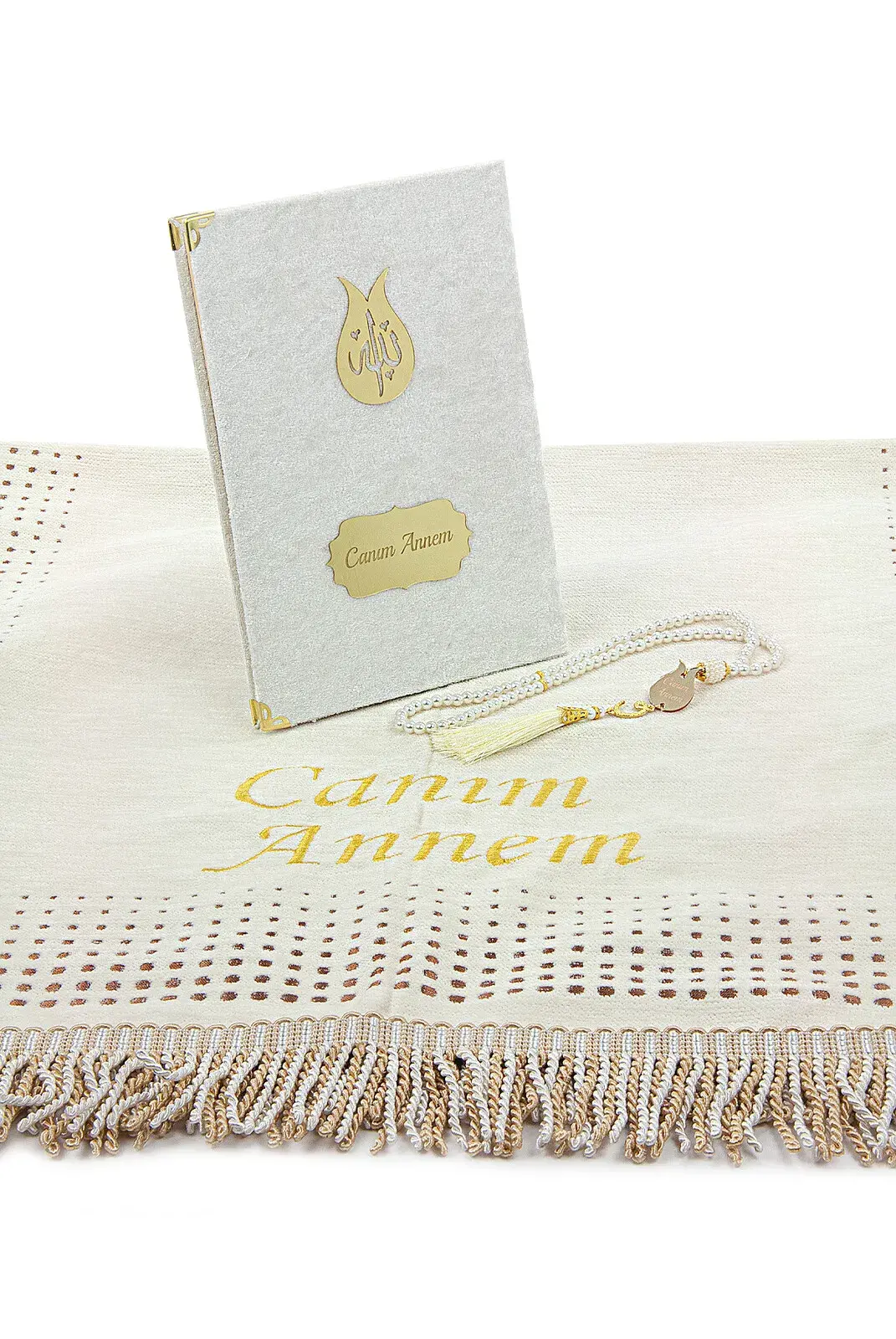 Anneler Gününe Özel İsim Nakışlı İnci Tesbih Yasin Kitabı Şönil Seccade Seti Beyaz
