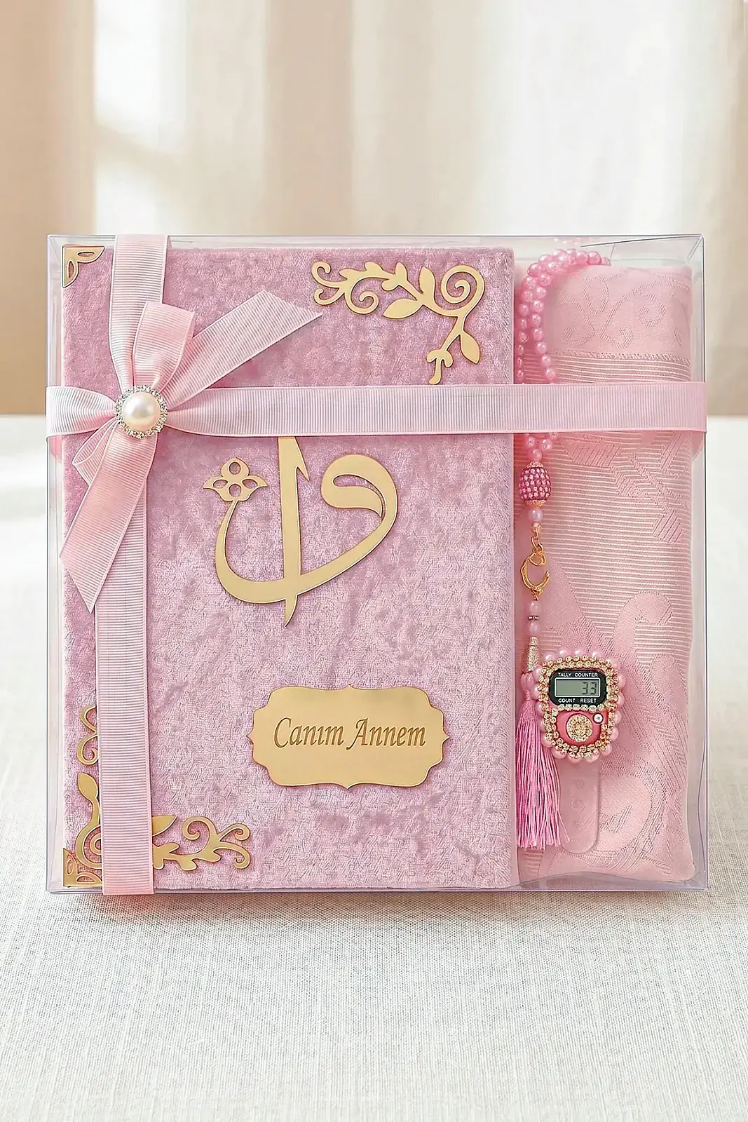 - 1 Adet Orta Boy Kur’an-ı Kerim (17x24 cm, kadife kaplı, Canım Annem pleksi yazılı)