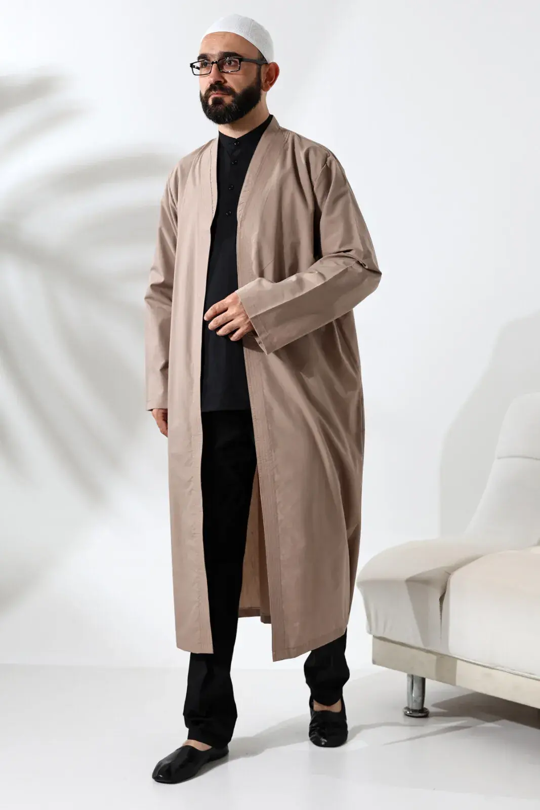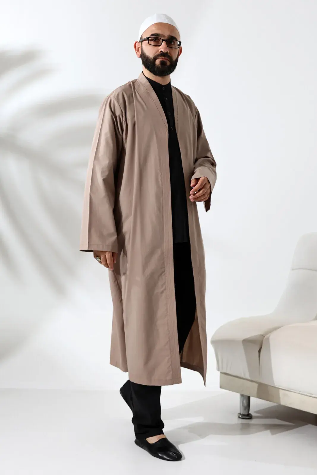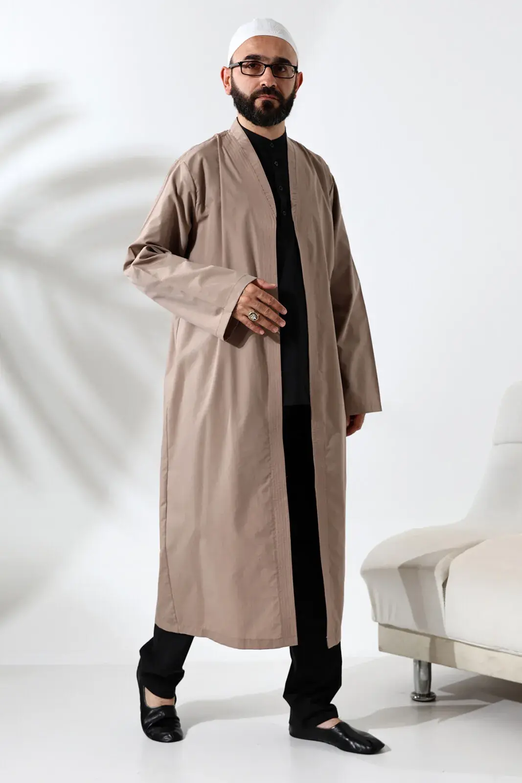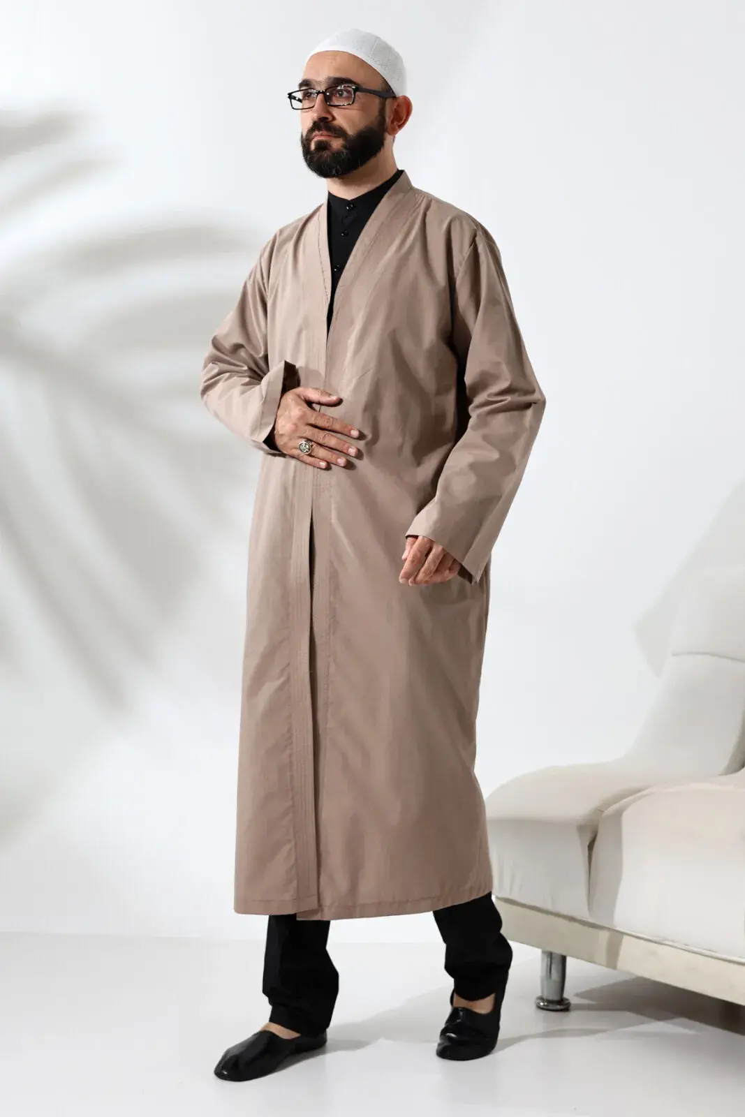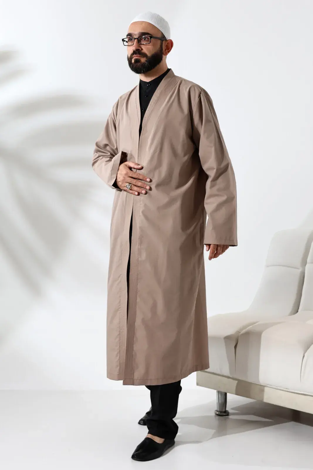 Bu namaz cübbesi, rahat kesimi ve düğmesiz önü açık tasarımıyla kullanıcıya hareket özgürlüğü sağlar, bu da ibadet sırasında rahatlıkla giyilmesini sağlar. Hem gündelik kullanıma hem de özel ibadet anlarına uygun bir kıyafettir.