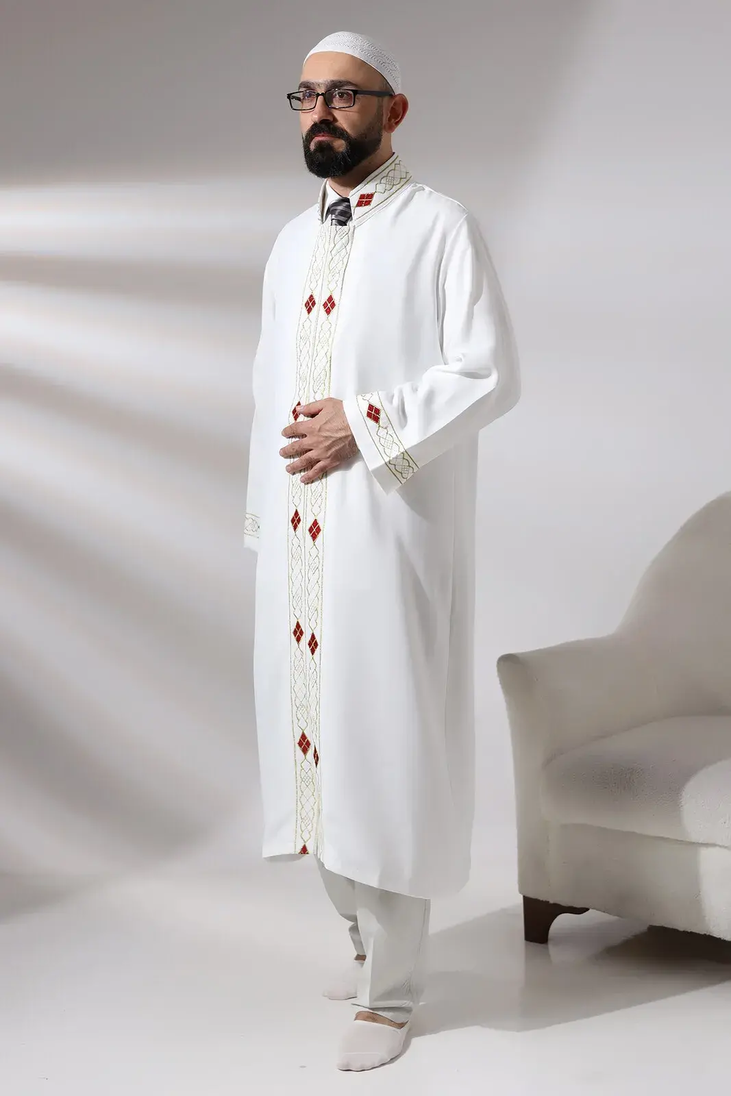 Geleneksel ve sade bir zarafetin birleşimi olan bu İmam Cübbesi, Alpaka pamuklu kumaşı sayesinde ibadet sırasında rahatlık sağlarken, önden kapatmalı gizli çıtçıtlı tasarımı kullanımı kolaylaştırır. Hakim yaka detayı, cübbeye geleneksel bir hava katarak sade bir şıklık sunarken, baklava benzeri nakış işlemeler estetik bir dokunuş ekler. Bu cübbe, ibadetlerde imamların ihtiyaçlarına uygun pratik ve zarif bir seçenek sunar. Geleneksel ve işlevsel tasarımı, imamların görevlerini yerine getirirken rahatlık ve şıklığı bir araya getirir.