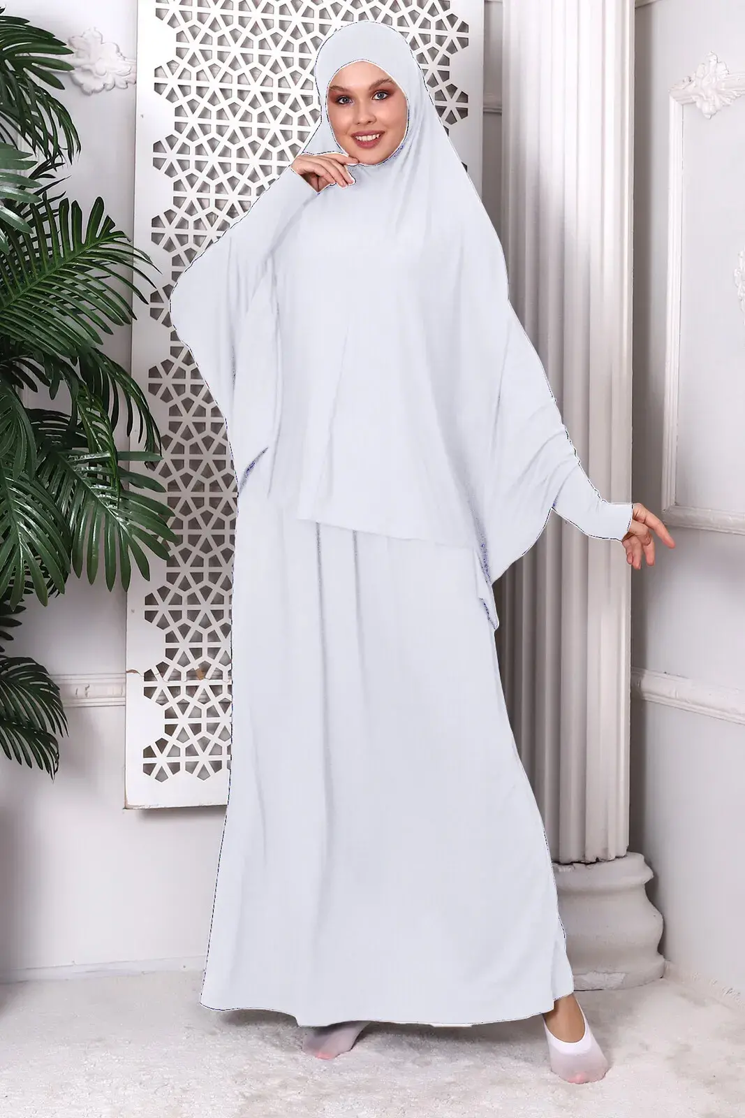 Beyaz Kadın İki Parça Peçeli Penye Namaz Elbisesi