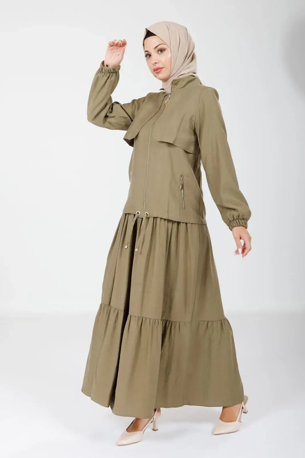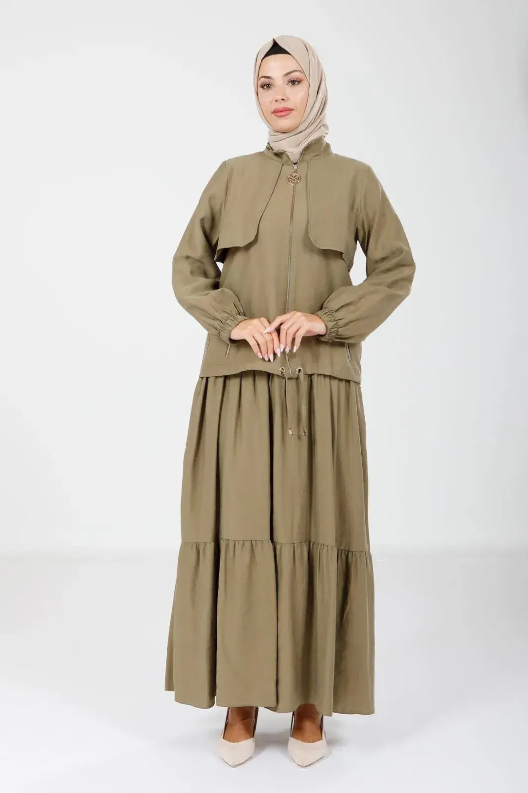 Günlük kullanımda konfor arayanların favorisi olacak bu ceketli tesettür elbise, şıklığıyla da dikkat çeker.