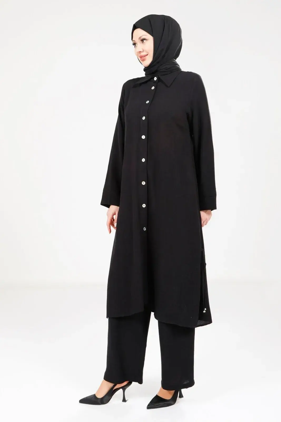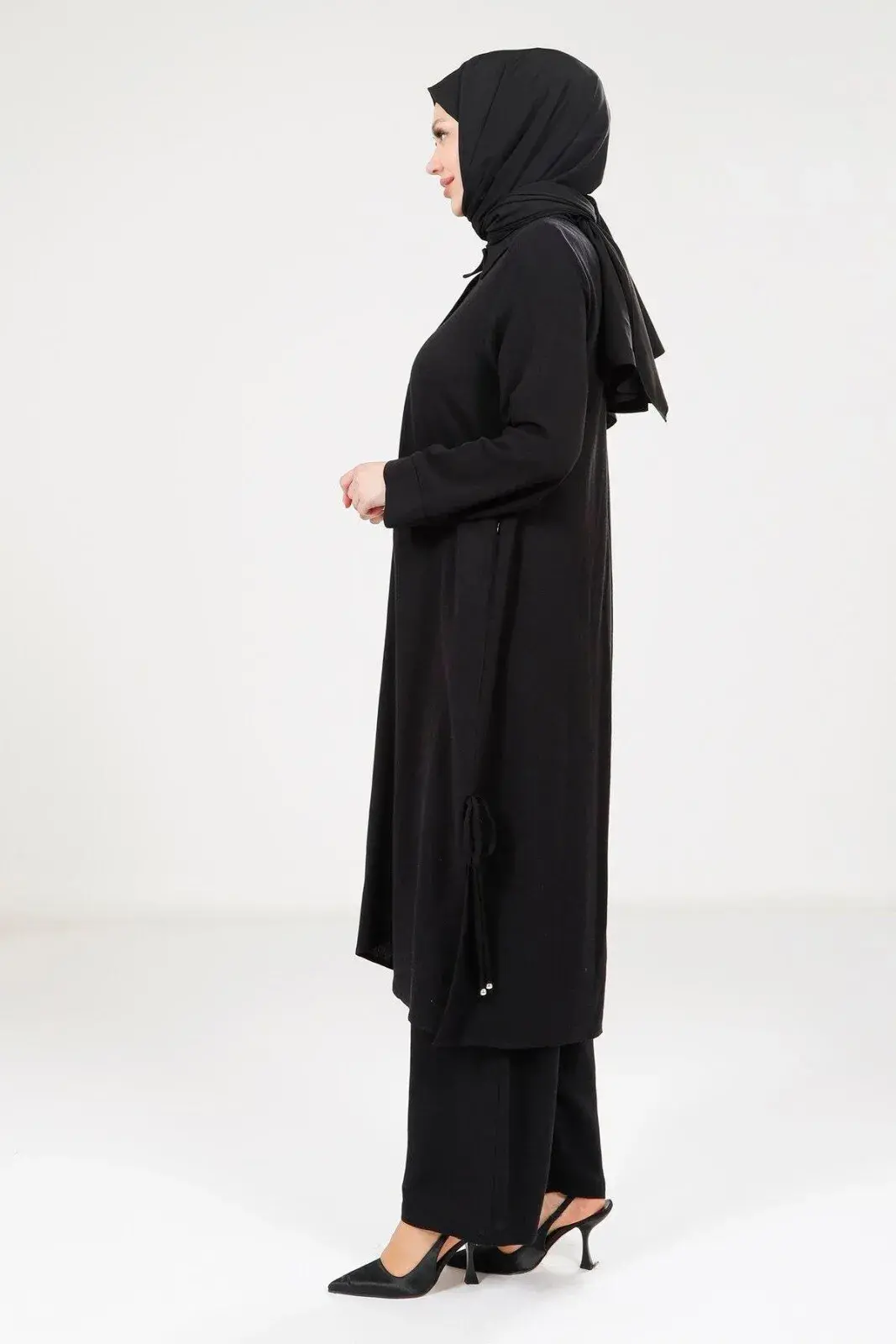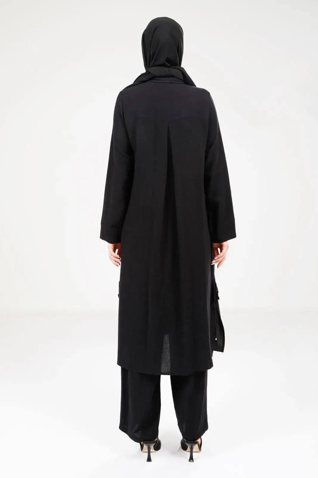 Yanlardan yırtmaçlı ve ip detaylıdır; boyu isteğe göre ayarlanabilir.