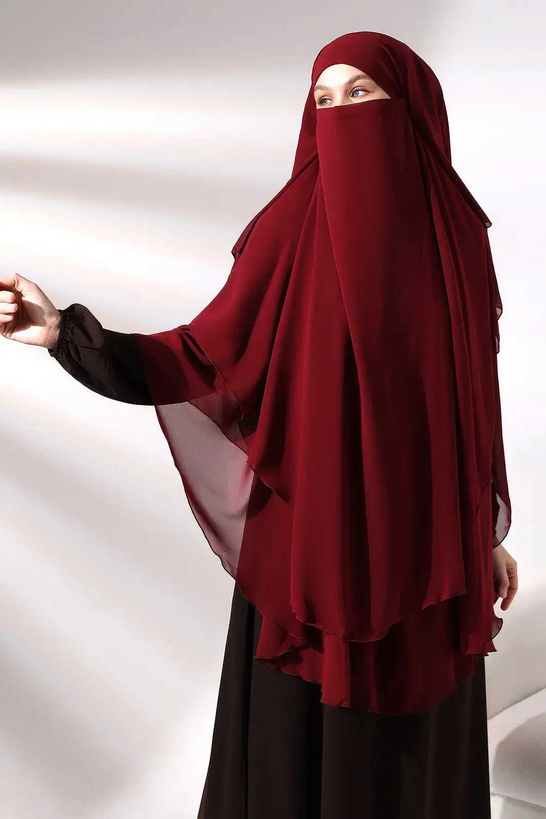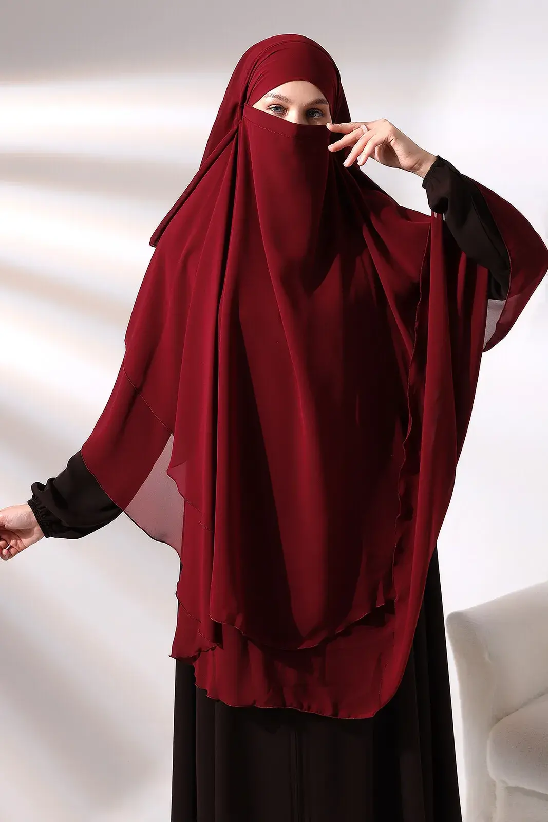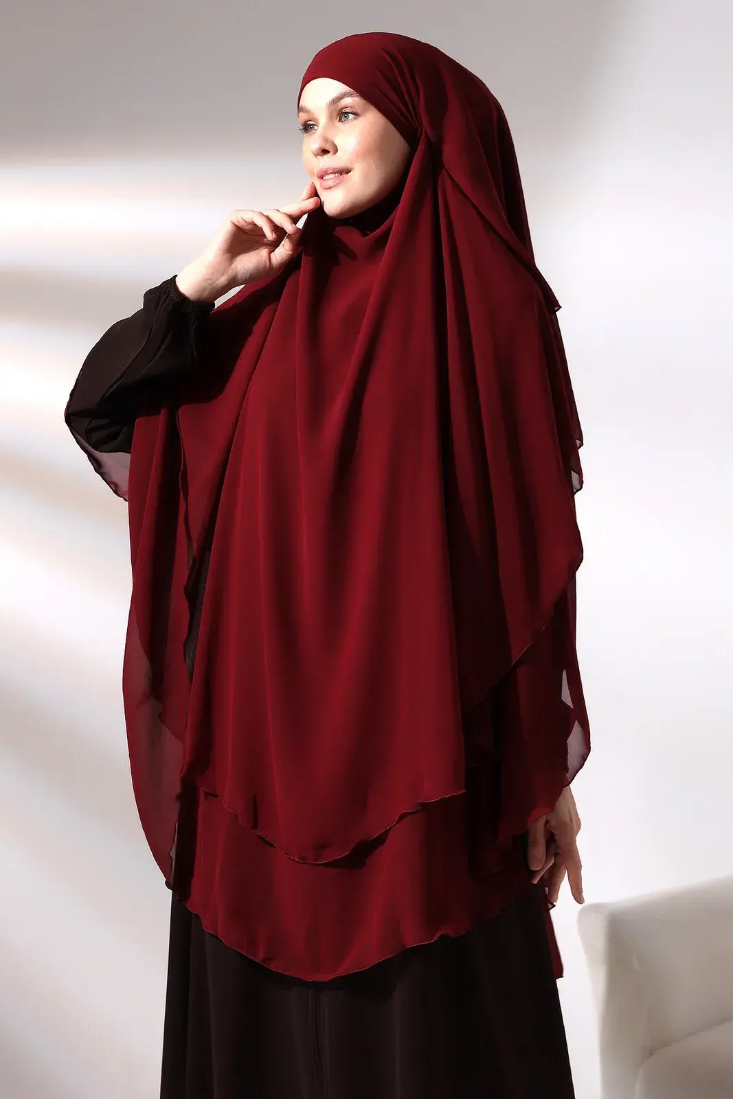 Bordo Şifon Üç Katlı Peçeli Uzun Tesettür Sufle Eşarp