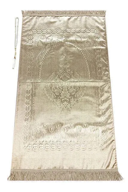 Silky Polyester Woven Lined Sponge Prayer Rug Weight: 1.000 gr including box Size: 1.15 x 67 cm Excluding Tassel The fringes are bouillon braided fringes. Lined Spongy