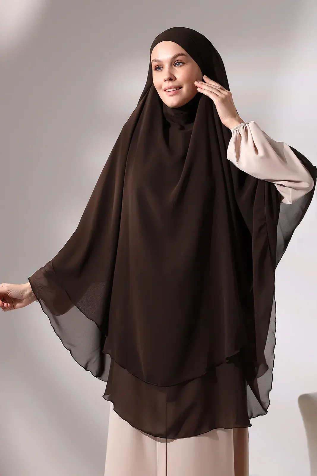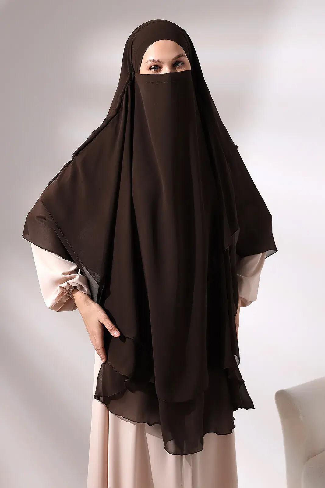 Product features Chiffon fabric Three storey LONG Veiled