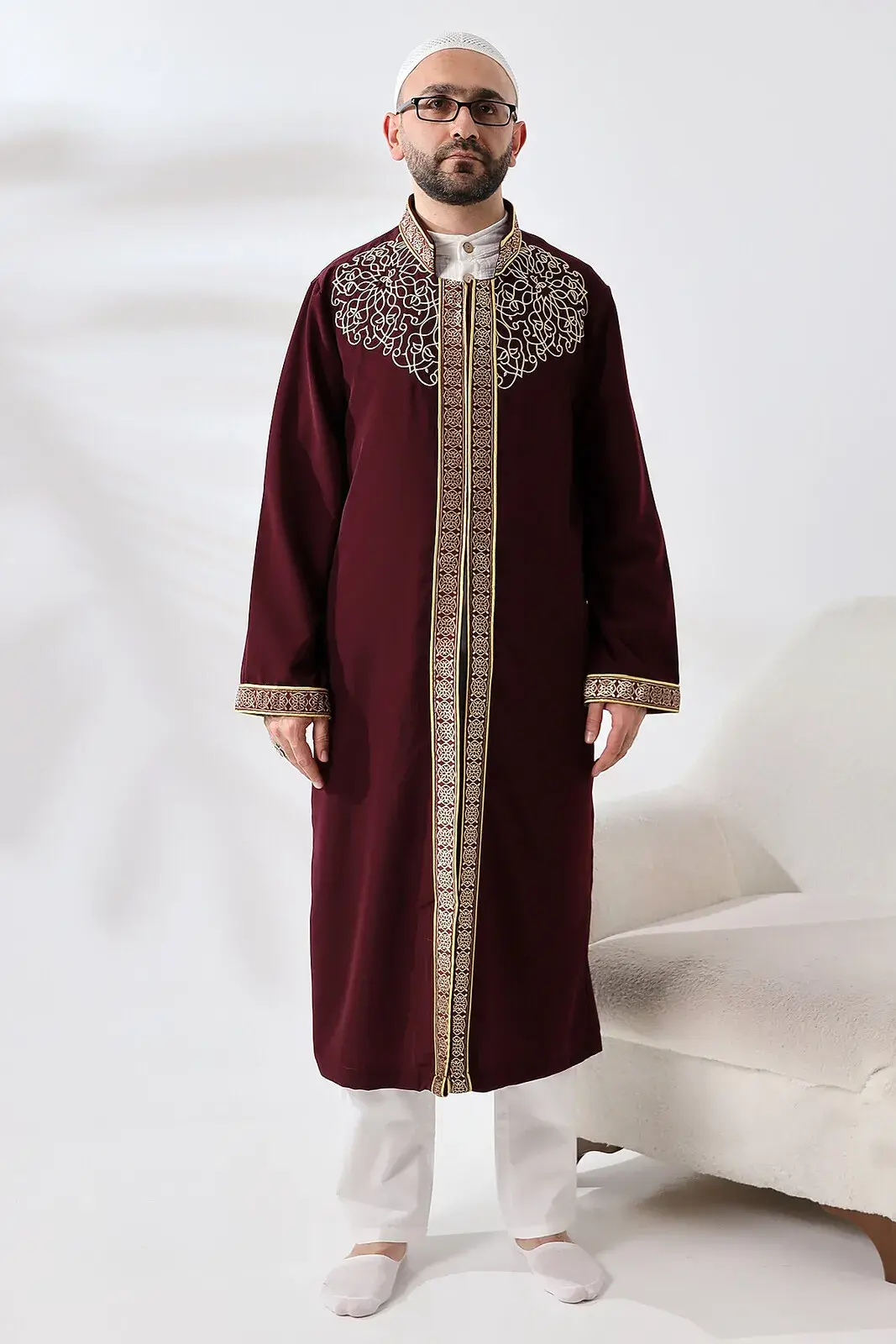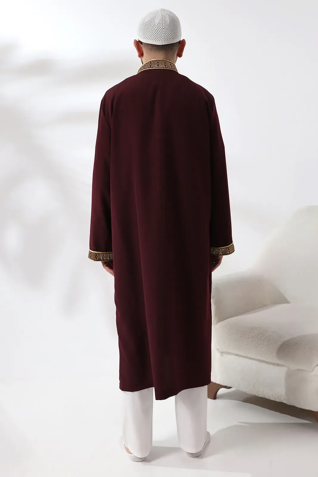 Burgundy Collar Men's Prayer Robe Stripe Embroidery Imam Robe