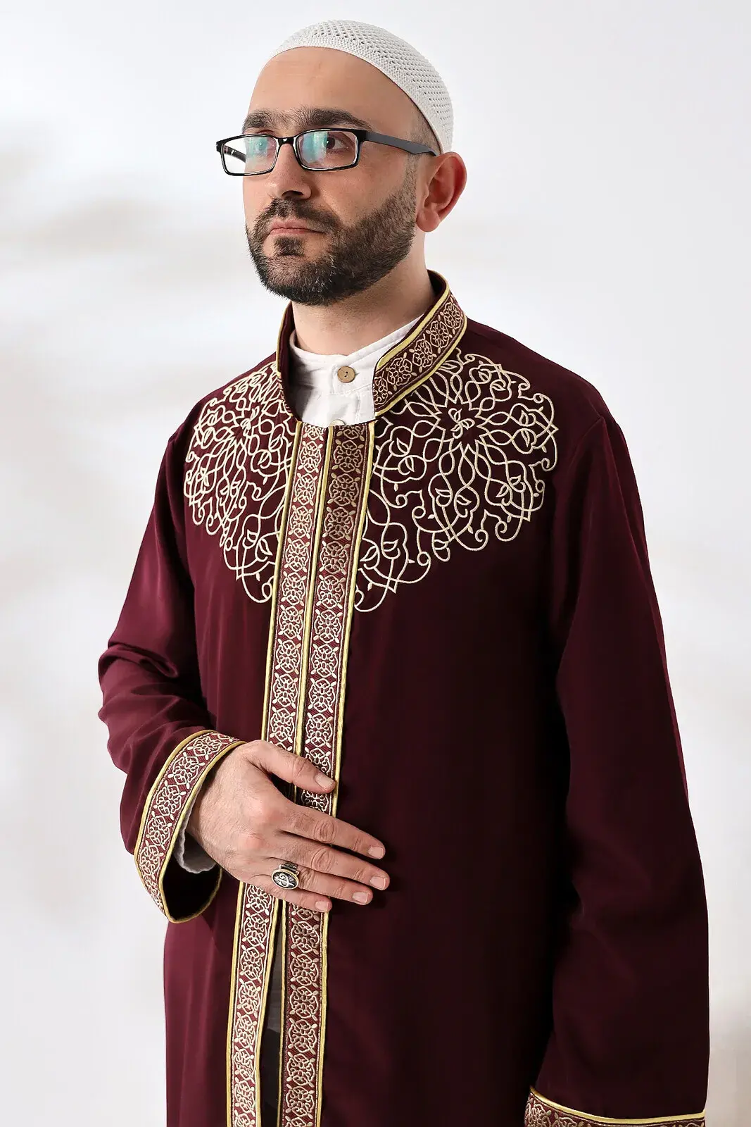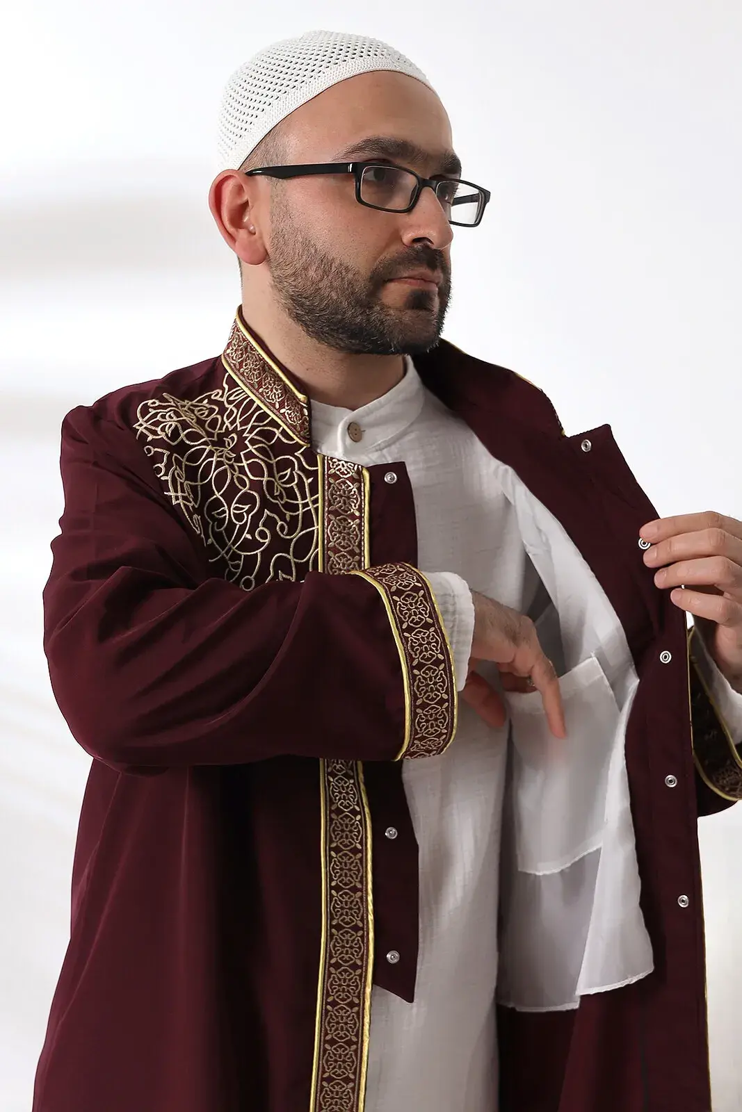 This Imam Robe, which is a combination of traditional and simple elegance, provides comfort during worship thanks to its Alpaca cotton fabric, while its front closure and hidden snap fastener design makes it easier to use. While the dominant collar detail adds a traditional atmosphere to the robe and offers simple elegance, the brocade embroidery adds an aesthetic touch. This robe offers a practical and elegant option to suit the needs of imams during prayers. Its traditional and functional design combines comfort and elegance while imams perform their duties.