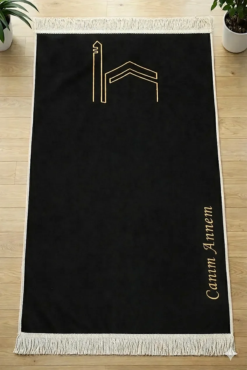 Canım Anneme - Cami Desenli Saçaklı Kadife Seccade - Siyah