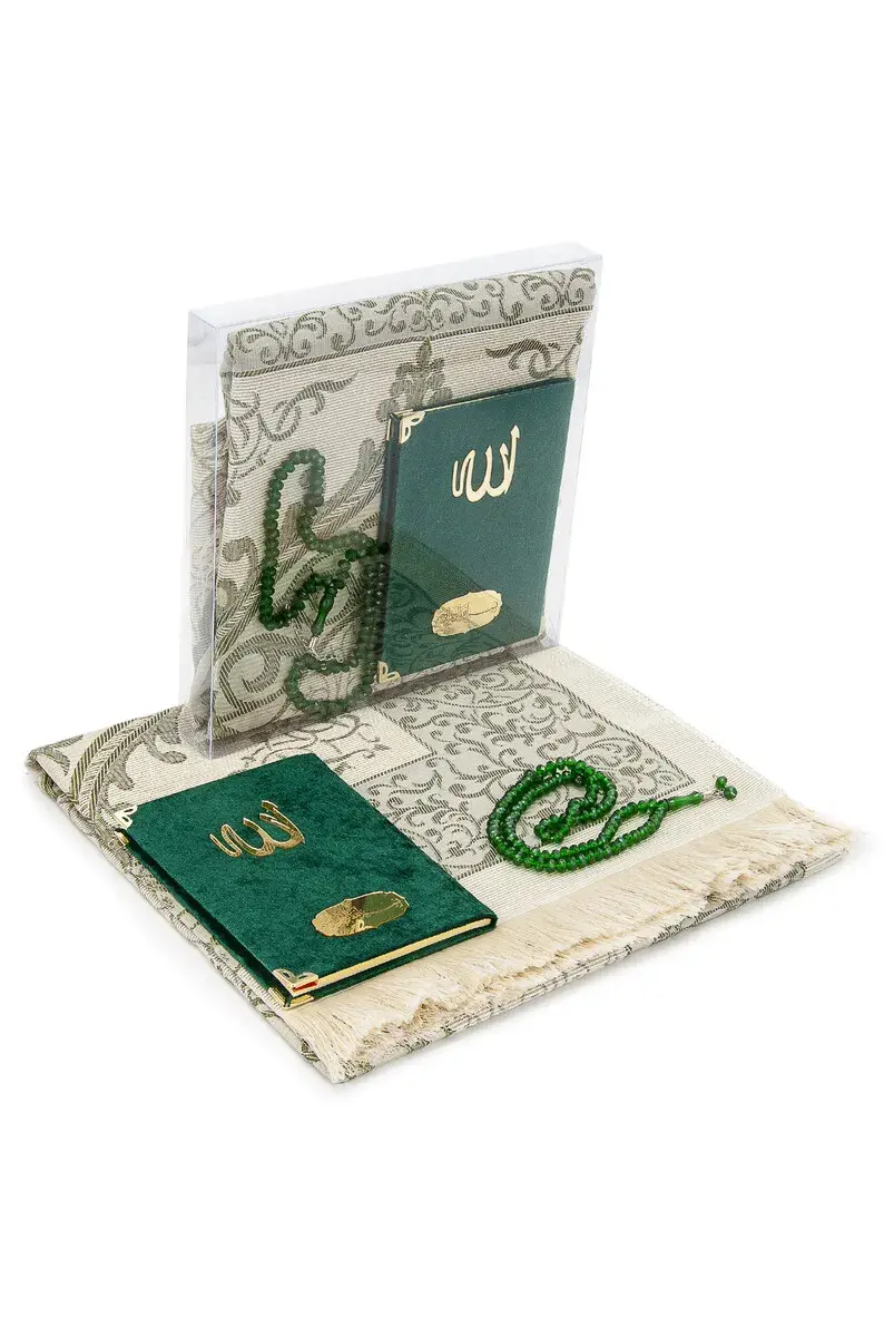 Çanta Boy Kadife Yasin Kitabı - Seccade - Tesbih ve Şeffaf Kutulu Mevlid Hediyeliği - Yeşil