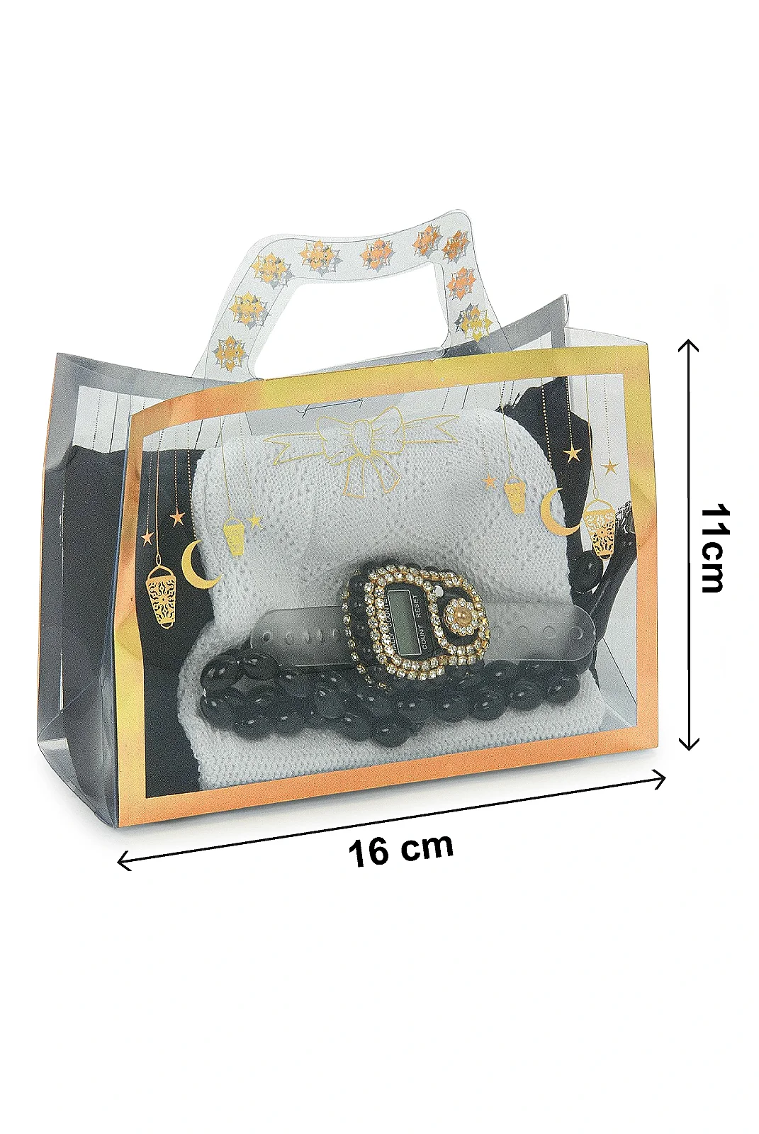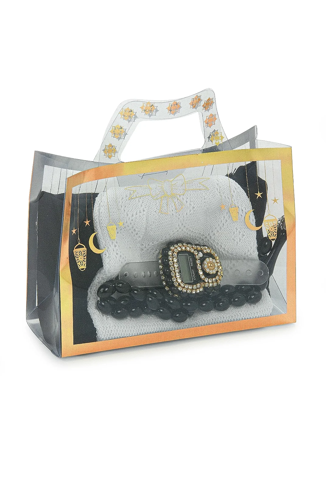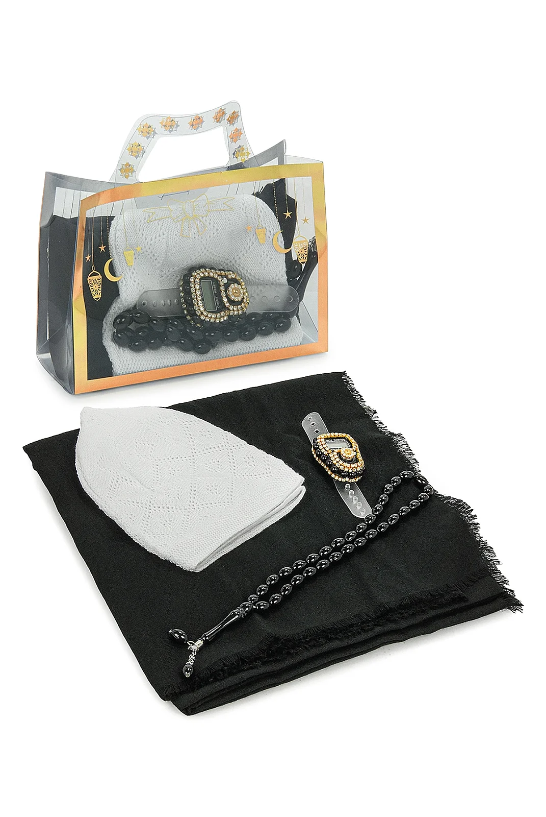 Set içeriğindeki ürünler özenle hazırlanır. Şal ve takke dikkatlice katlanır, tesbih ve zikirmatik uyumlu şekilde yerleştirilir ve kulplu PVC hediye çantası içerisinde şık bir sunum oluşturularak gönderime hazır hale getirilir.