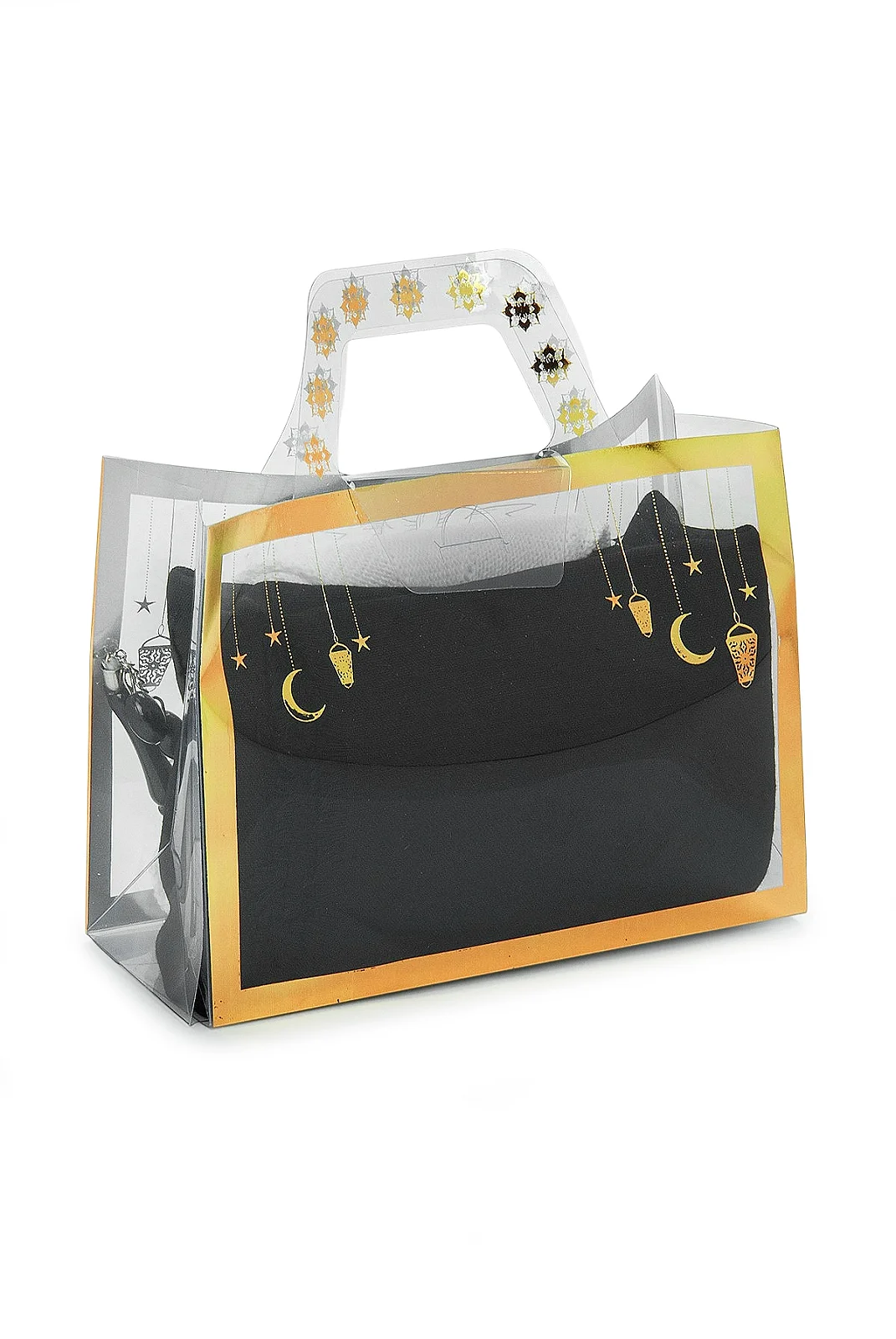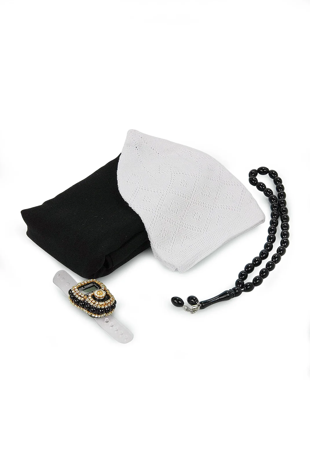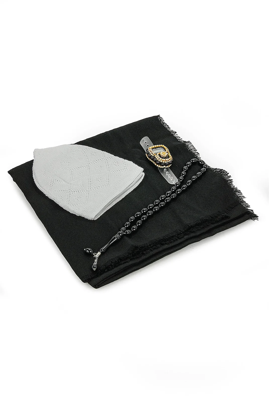 Set içeriğindeki ürünler özenle hazırlanır. Şal ve takke dikkatlice katlanır, tesbih ve zikirmatik uyumlu şekilde yerleştirilir ve kulplu PVC hediye çantası içerisinde şık bir sunum oluşturularak gönderime hazır hale getirilir.