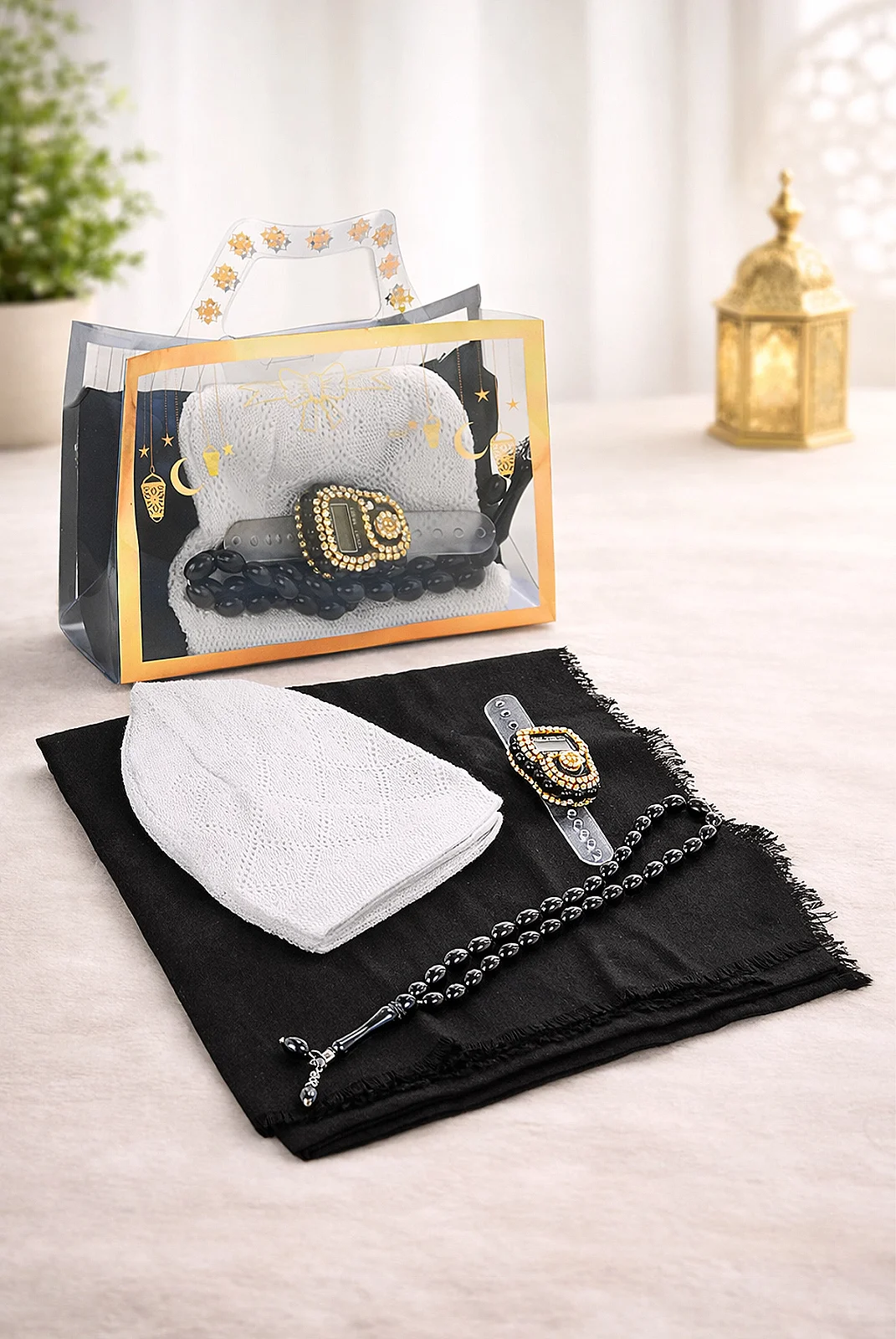 Şıklık ve maneviyatı bir araya getiren bu özel set, sevdiklerinize anlamlı ve zarif bir hediye sunmak için özenle hazırlanmıştır. Kulplu PVC hediye çantası ile birlikte sunulan set, hem estetik hem de kullanışlı bir hediye alternatifidir.