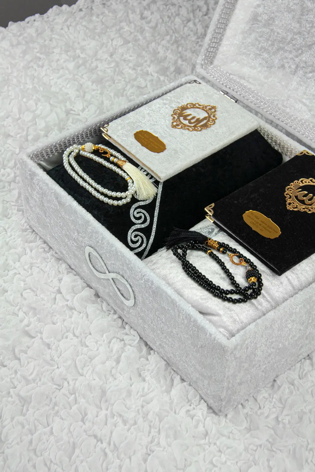 Set, yine kadife kaplama şık bir sandık içerisinde sunulmaktadır. Sandığın üzerinde çiftin baş harfleri ve sonsuzluk simgesi yer almakta, bu da ürüne hem kişisel hem de anlamlı bir detay katmaktadır. Bu özelliğiyle gelin ve damat bohçalarının vazgeçilmez parçalarından biridir.
