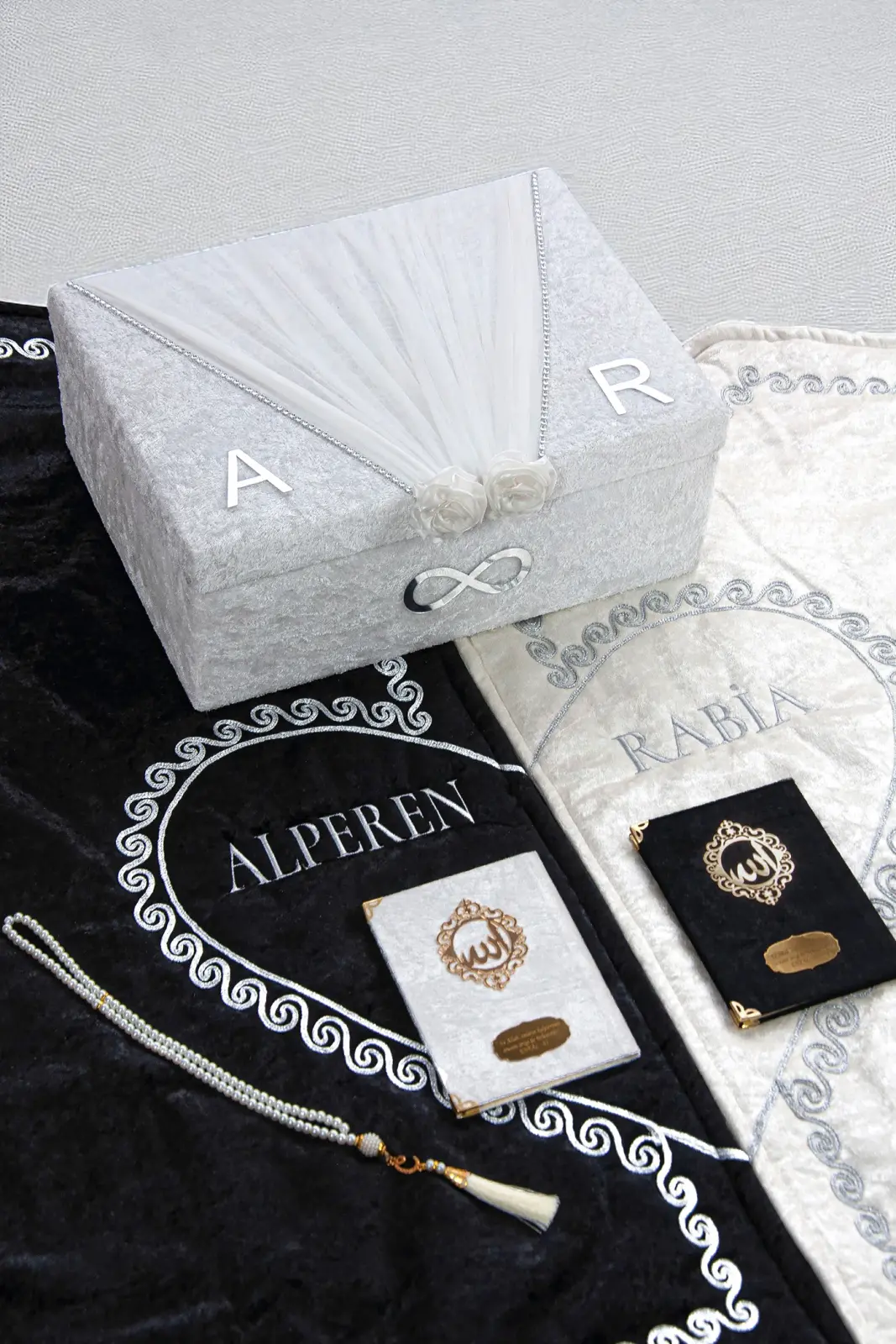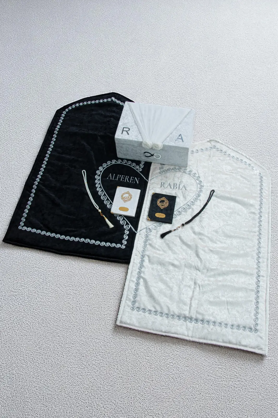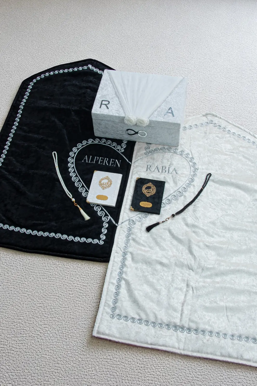 Çeyizlik Kişiye Özel İsimli Kalpli Seccade Seti, zarafeti ve manevi değeri bir arada sunan özel bir tasarımdır. Seccadeler yumuşacık kadife kumaştan üretilmiş olup, kalp motifleri ve isim işlemeleriyle kişiye özel hale getirilmiştir.