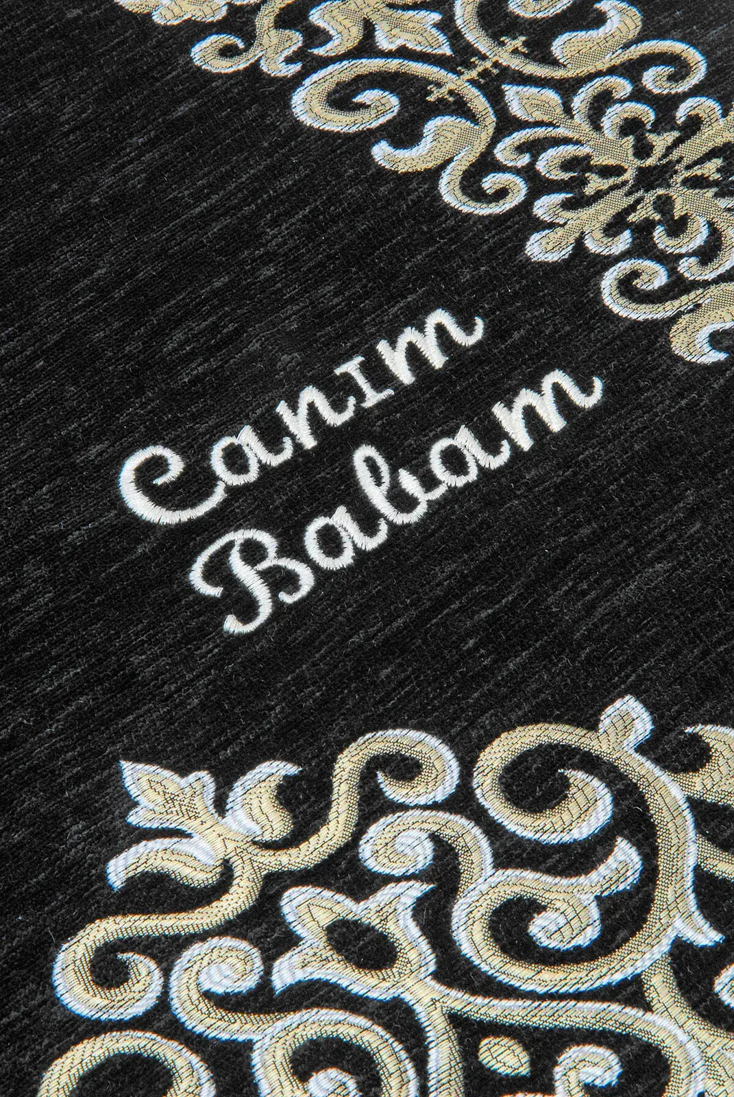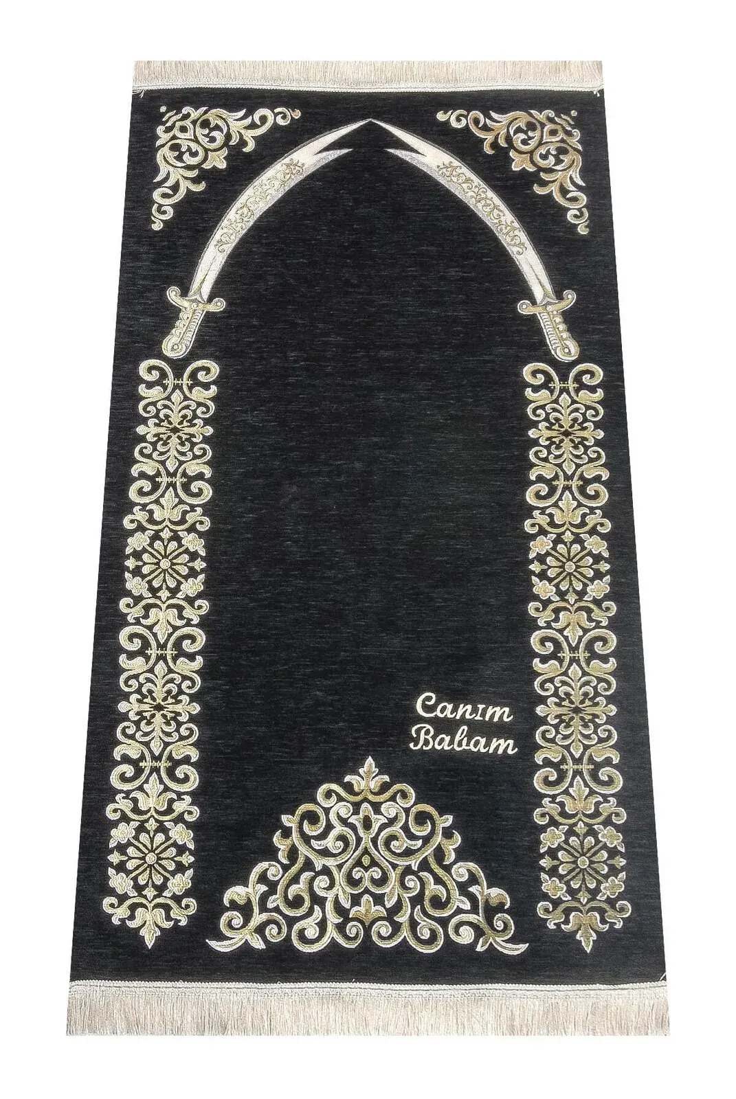 Custom Name Embroidered Zülfikar Patterned Ultra Plus Chenille Prayer Rug Black Color