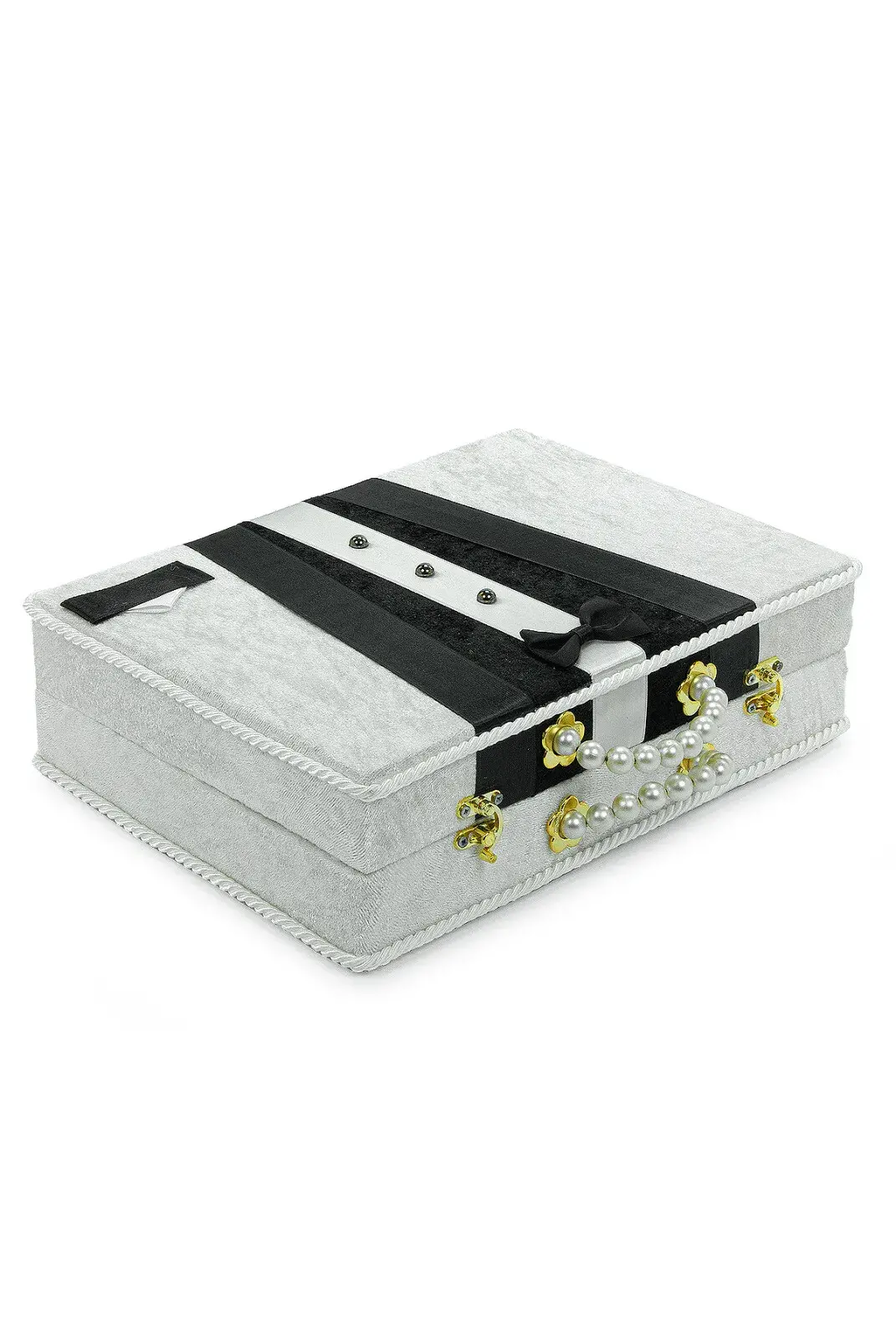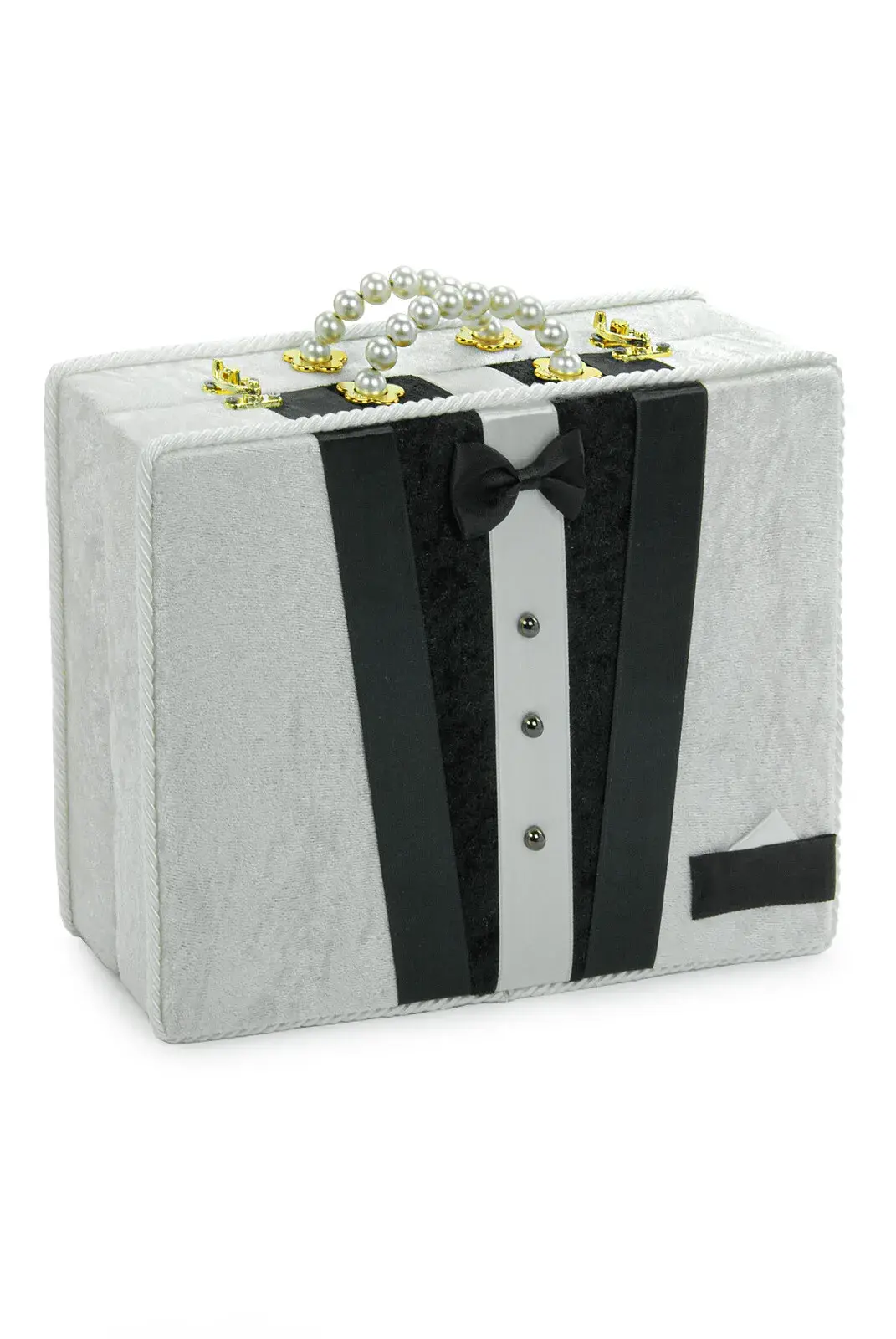 Bu şık ve zarif kadife sandık, damat bohçası için özel olarak tasarlanmıştır. Beyaz kadife kumaş ile kaplanmış olan sandık, hem estetik hem de işlevsel bir kullanım sunar. Kaliteli MDF malzemeden üretilmiş yapısı, uzun ömürlü ve dayanıklı bir kullanım sağlar.
