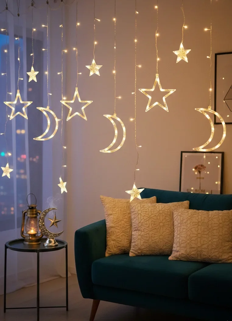 Hilal ve Yıldız Temalı Estetik Tasarım: Ramazan süslemelerinin vazgeçilmezi olan ay-yıldız figürleri, pencere ve duvarlarınıza şıklık katar. İftar sofralarınızda ve özel davetlerinizde huzurlu bir ortam sağlar.
