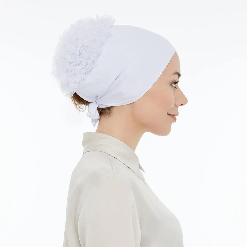 Dikişli Kaymaz Güpür Fırfırlı Bone Beyaz