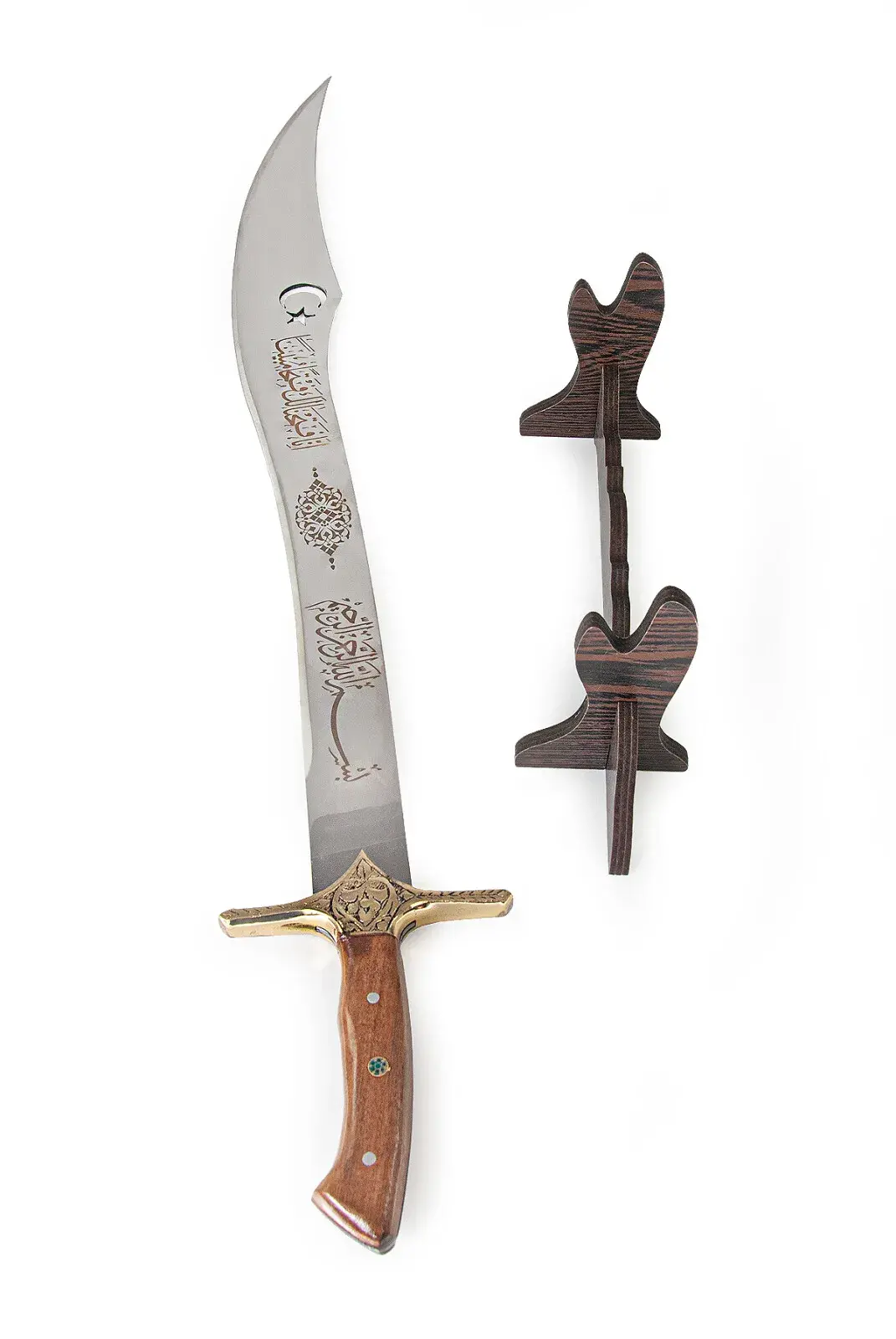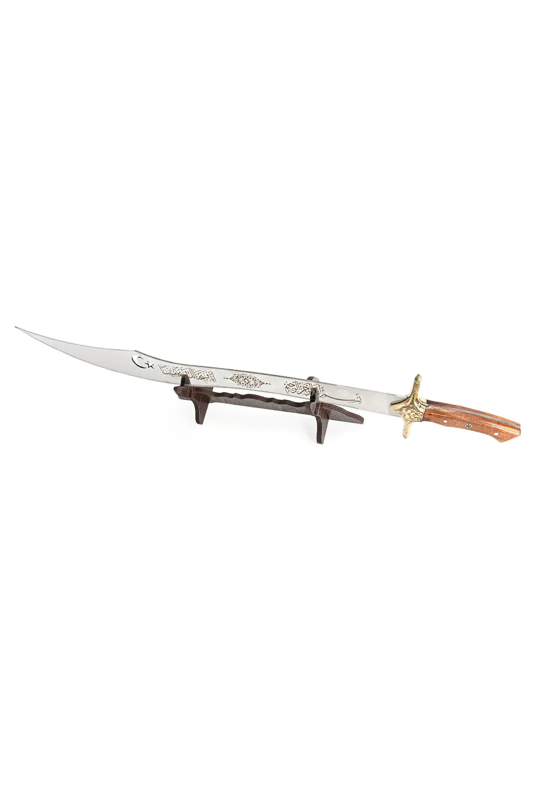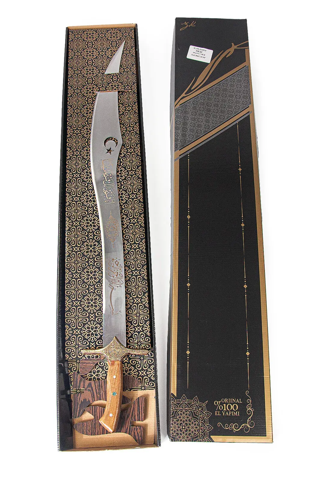- İşlemeli Detaylar: Kılıç üzerinde Arapça yazı, hilal ve süslemeler yer alır, estetik ve manevi bir anlam sunar.