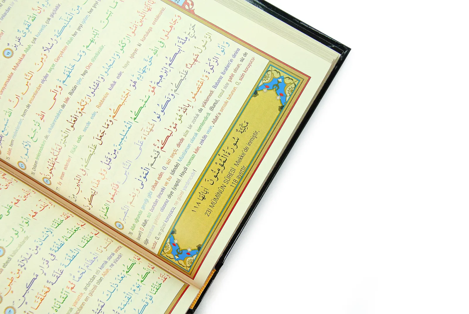 Elmalılı Muhammed Hamdi Yazır’ın klasikleşmiş “Hak Dini Kur’an Dili” tefsirinden yola çıkılarak hazırlanmış bu Renkli Kelime Mealli Kur’an-ı Kerim, okuyucuya Arapça kelimeler ile Türkçe karşılıklarını renk kodlarıyla birebir eşleştirerek anlam bütünlüğü sağlar.