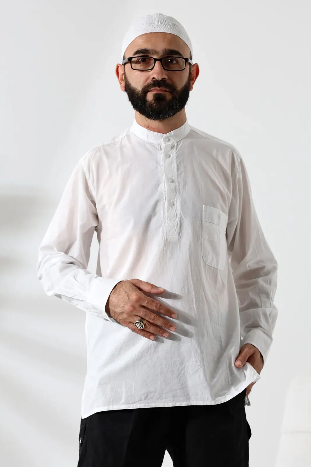 Erkek %100 Pamuk Vual Rahat Kesim Hakim Yaka Yarım Pat Beyaz Hac Umre Gömlek