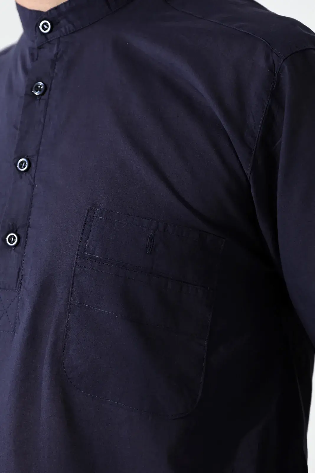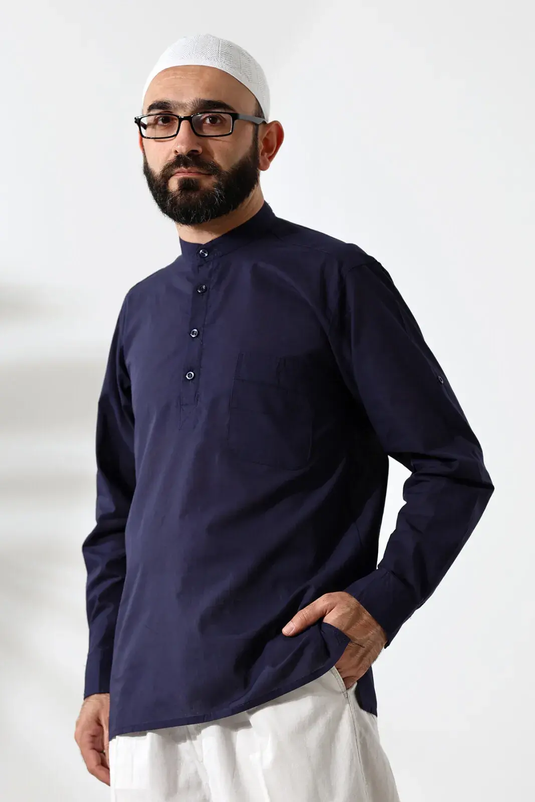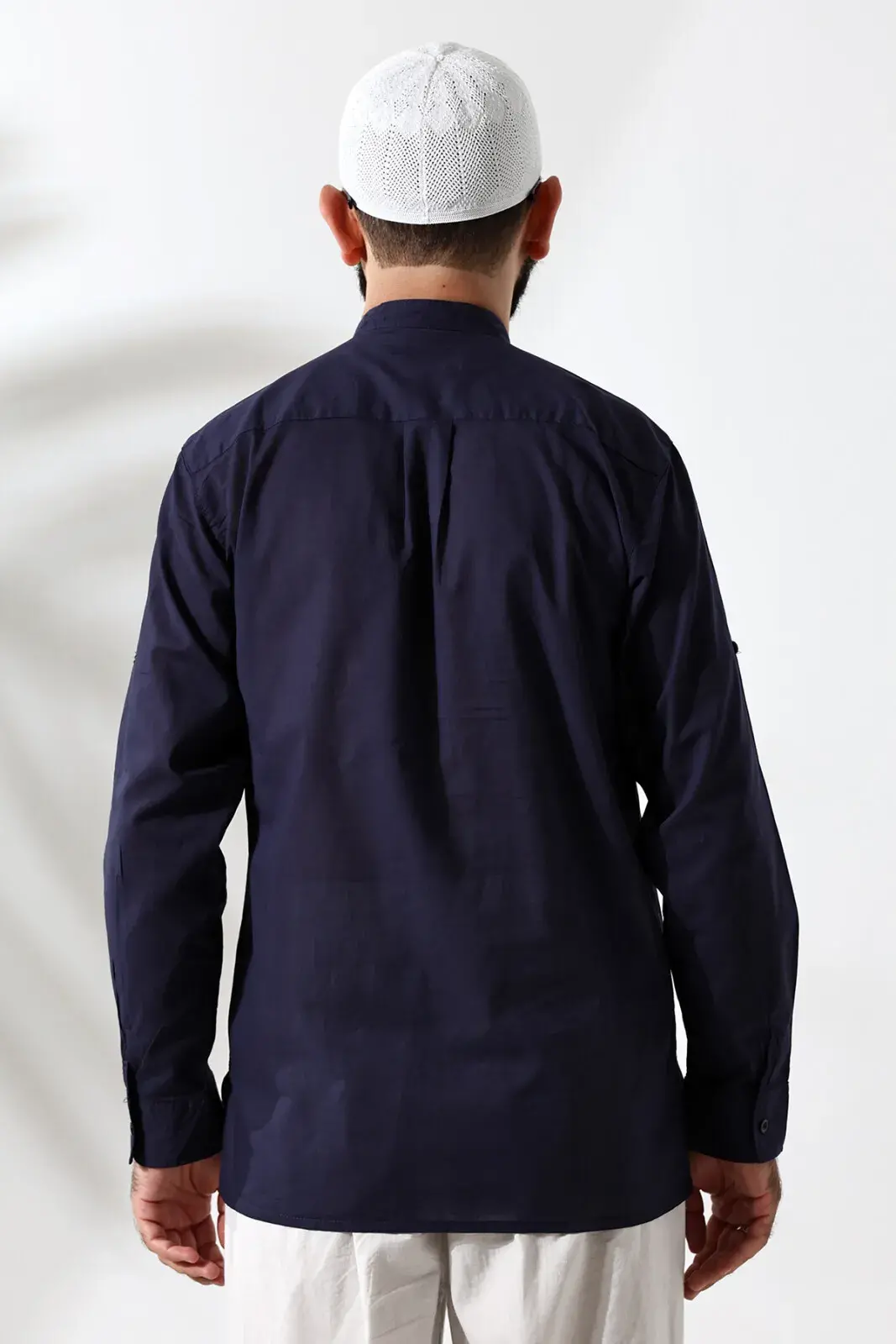 Erkek %100 Pamuk Vual Rahat Kesim Hakim Yaka Yarım Pat Lacivert Hac Umre Gömlek