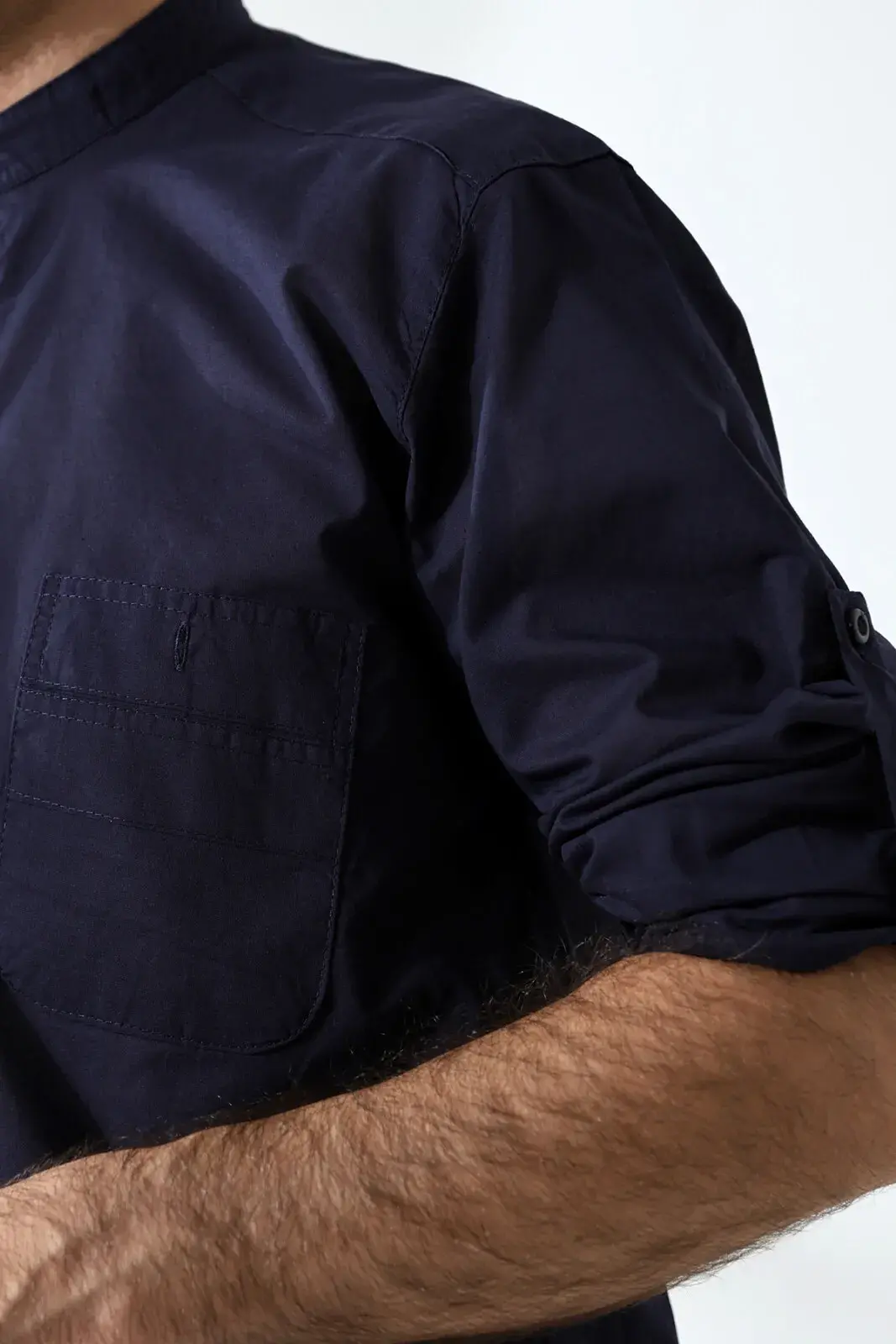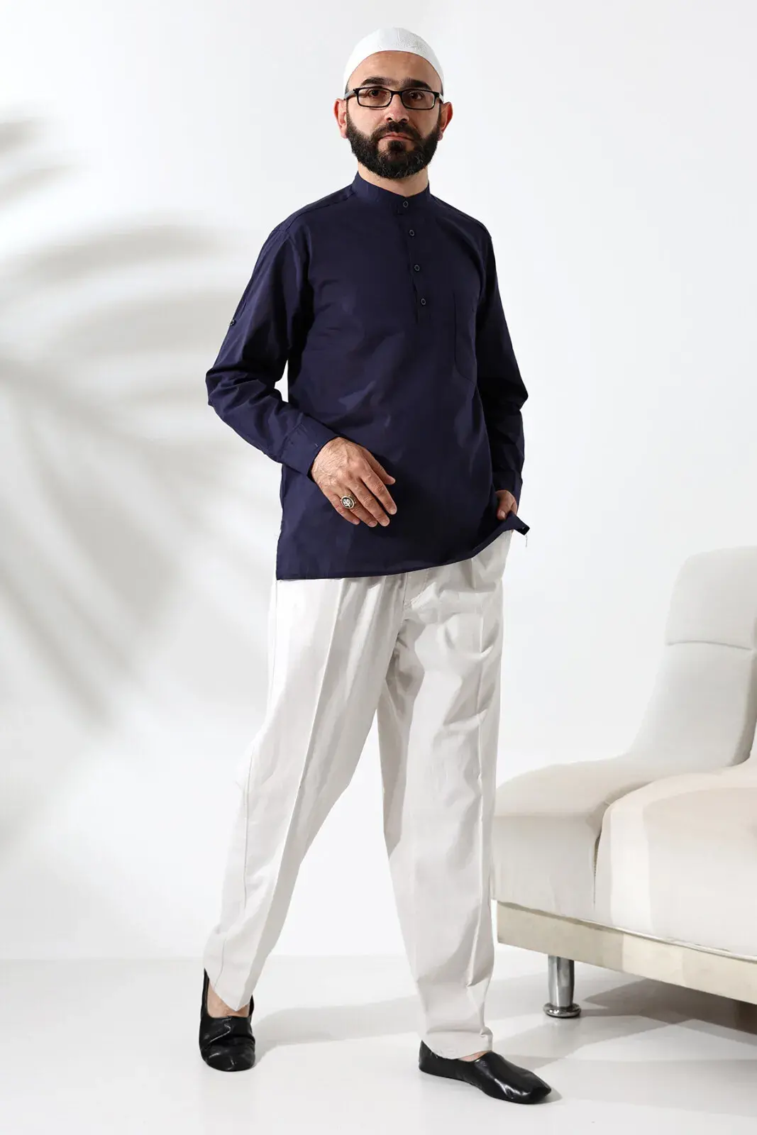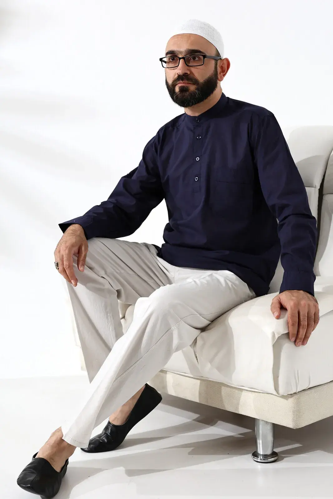 Erkek %100 Pamuk Vual Rahat Kesim Hakim Yaka Yarım Pat Lacivert Hac Umre Gömlek