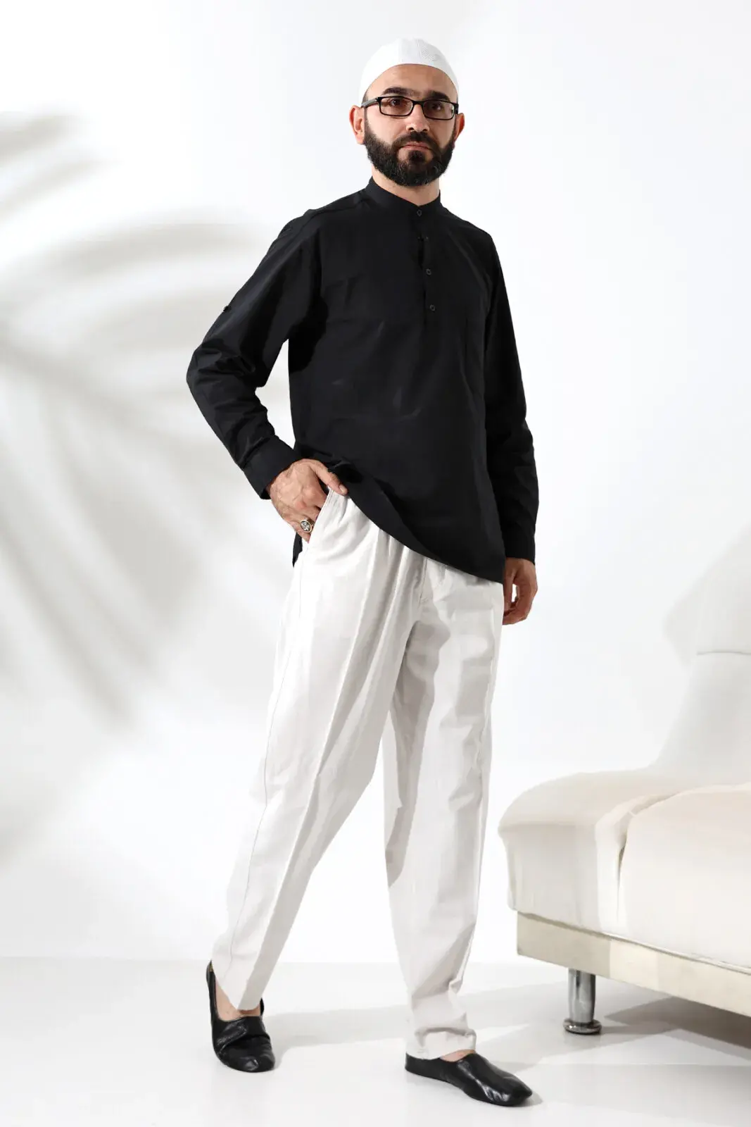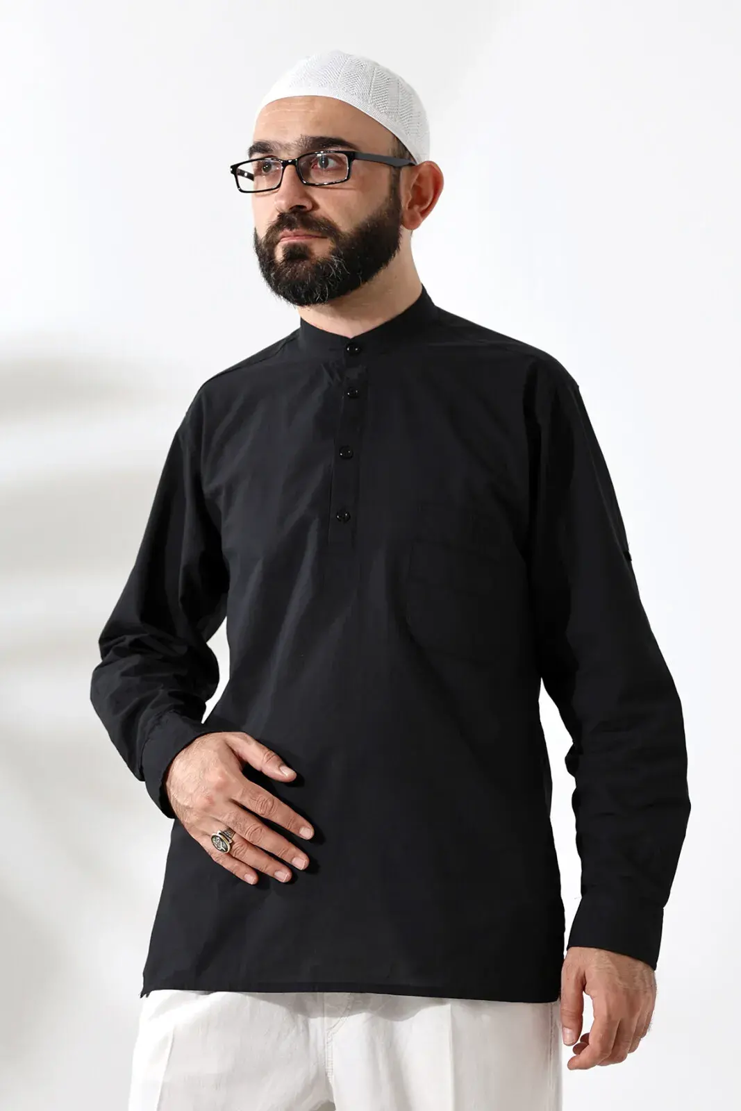 Erkek %100 Pamuk Vual Rahat Kesim Hakim Yaka Yarım Pat Siyah Hac Umre Gömlek