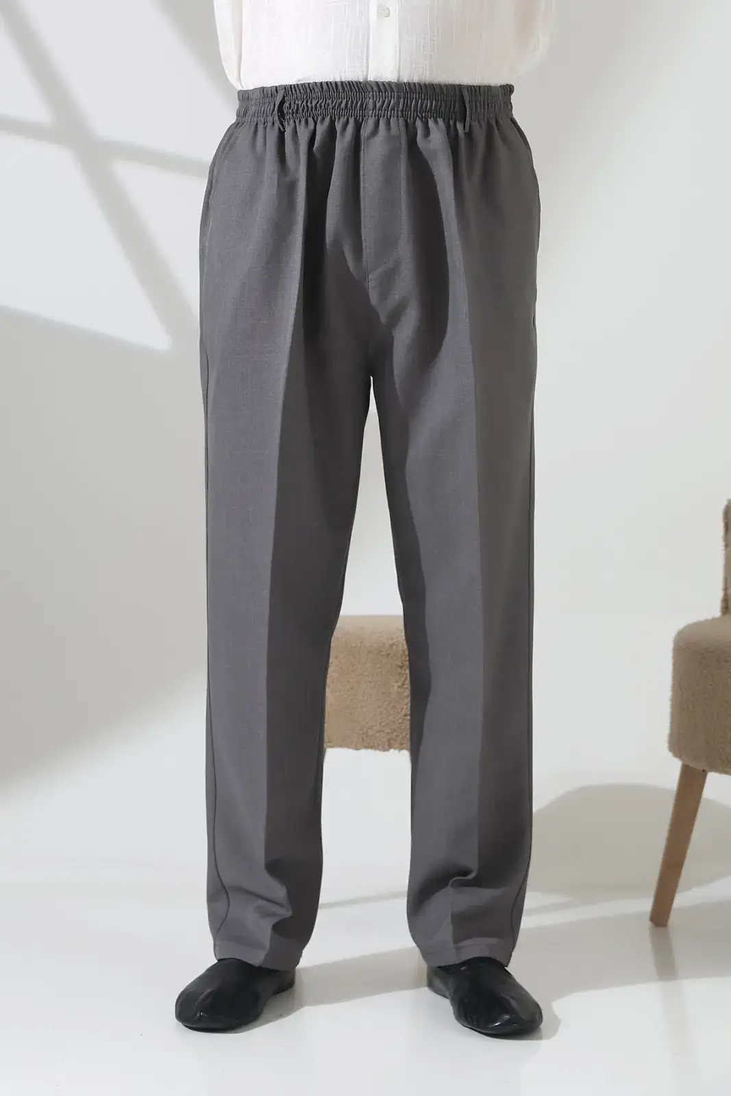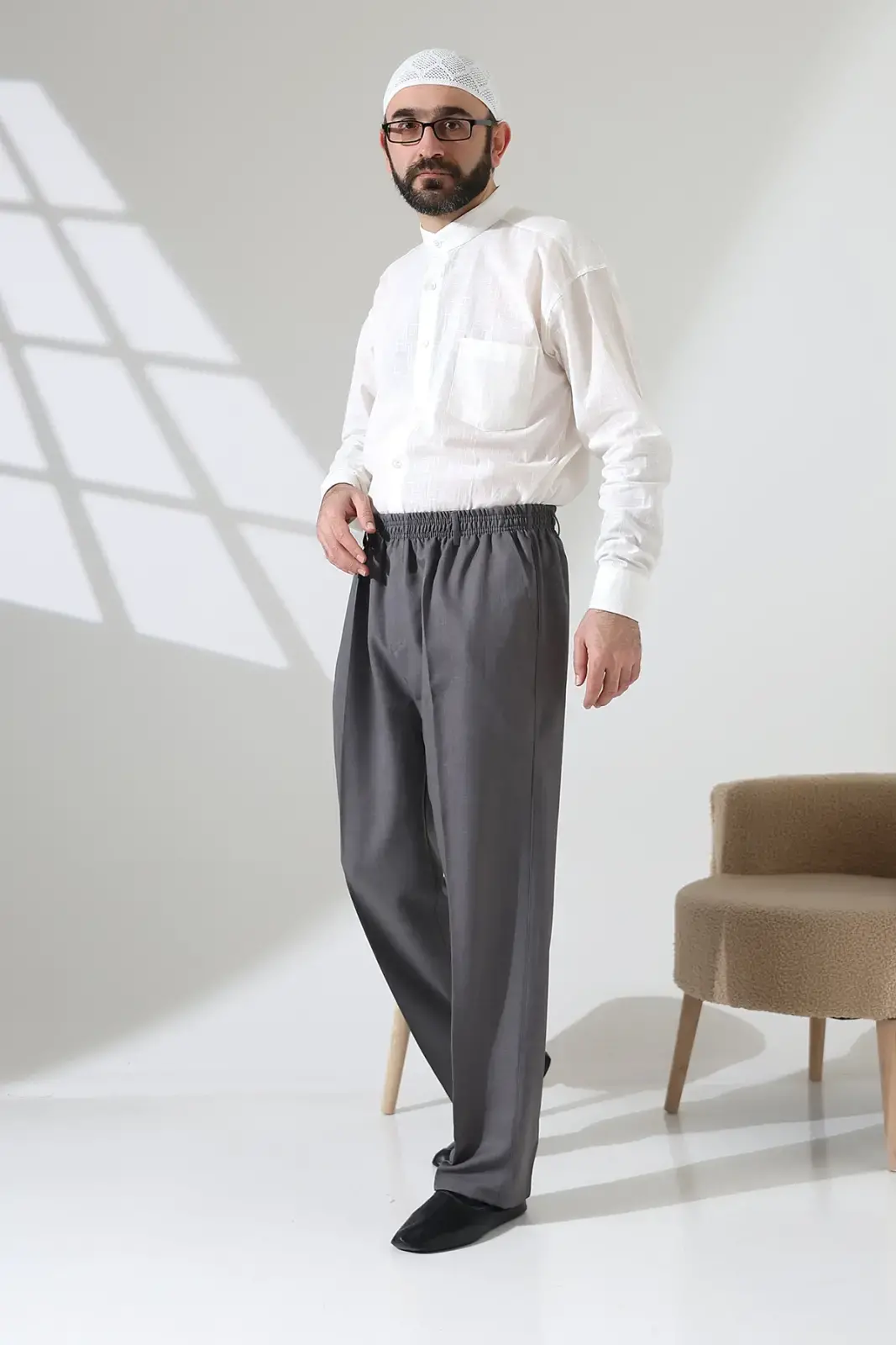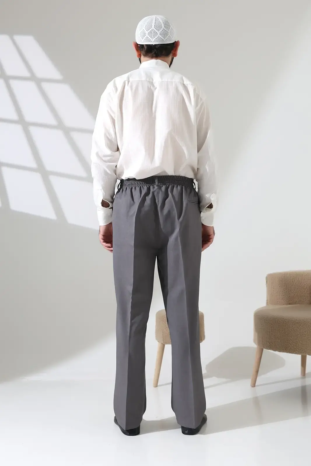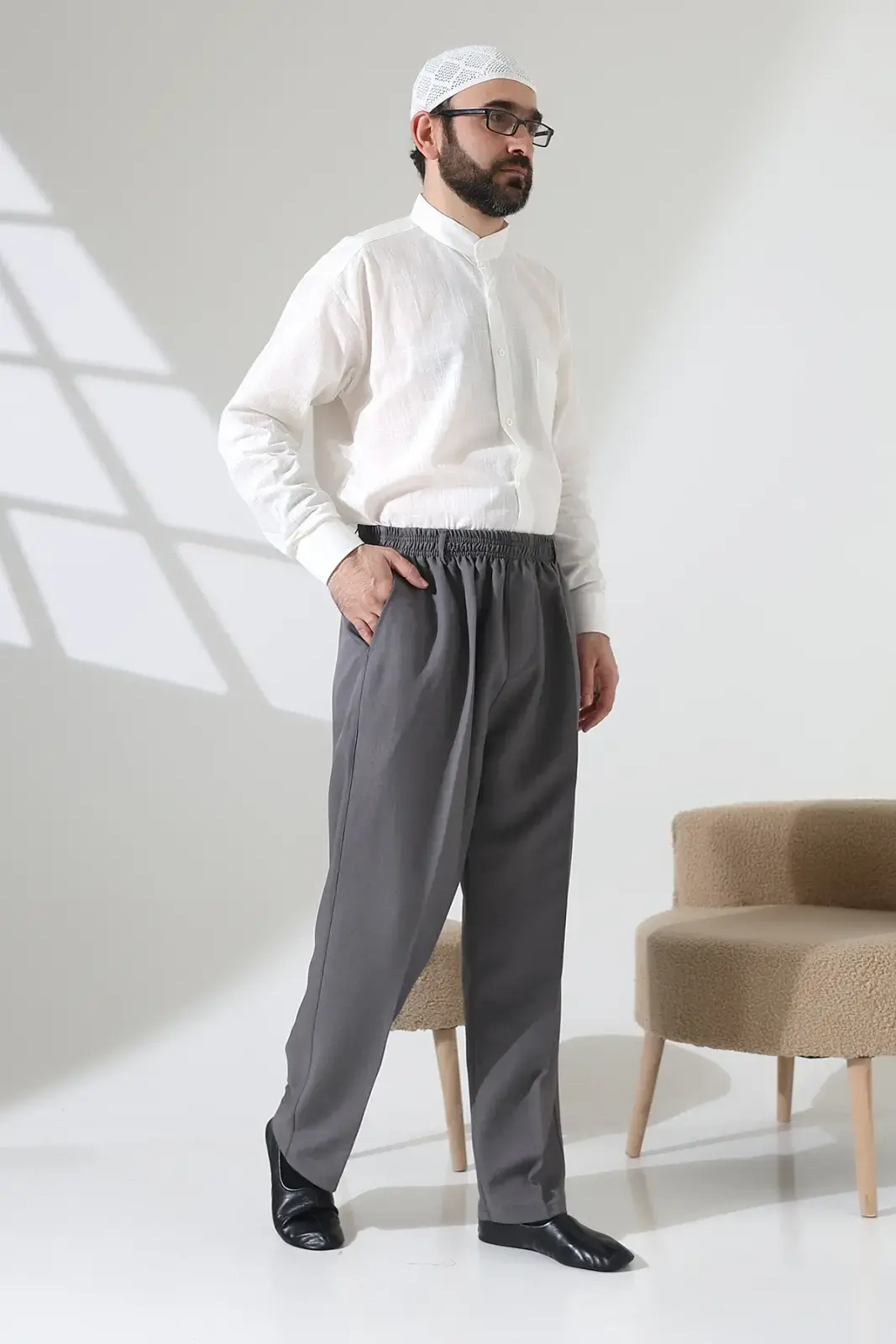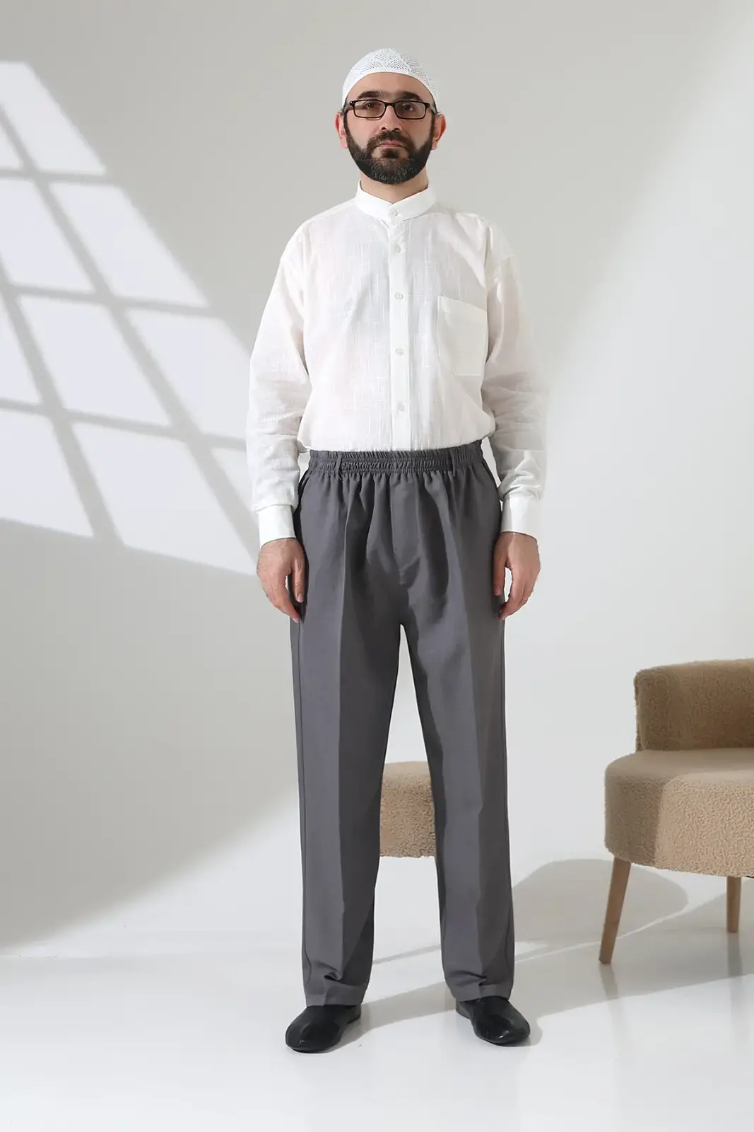 Erkek Beli Lastikli Cepli Hac Umre Kumaş Şalvar Pantolon - Açık Gri (ISR)