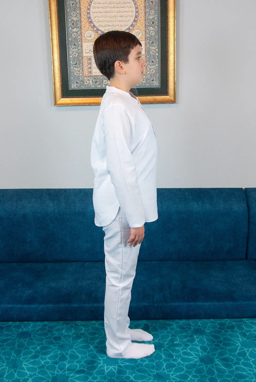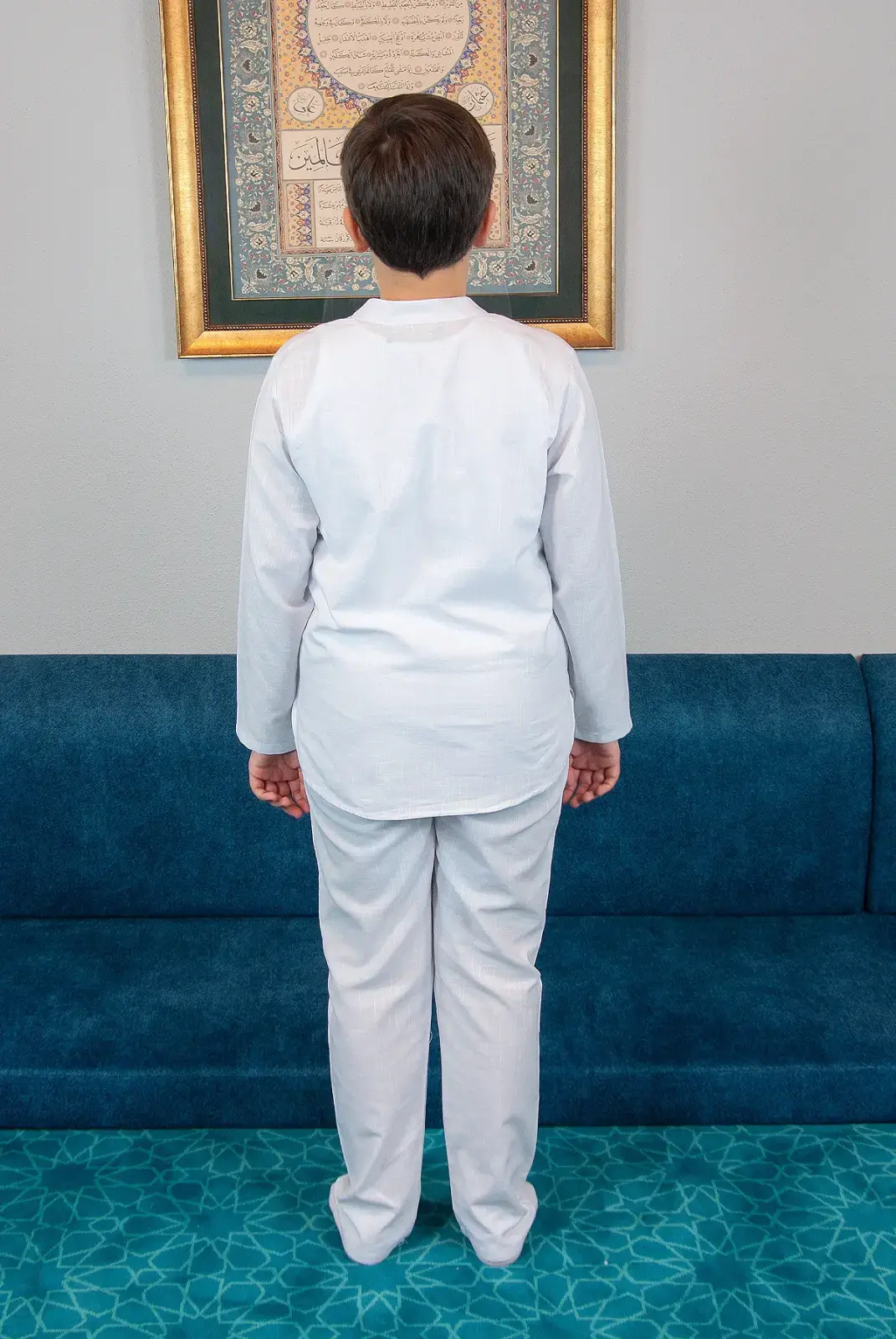 Çocuklar için özel olarak tasarlanmış bu takım, günlük kullanımın yanı sıra Hac ve Umre ziyaretlerinde rahatlıkla tercih edilebilir. Sade ve şık tasarımıyla dikkat çeken takım, hafif ve nefes alabilen kumaşı sayesinde çocukların gün boyu konforlu ve özgürce hareket etmesini sağlar.