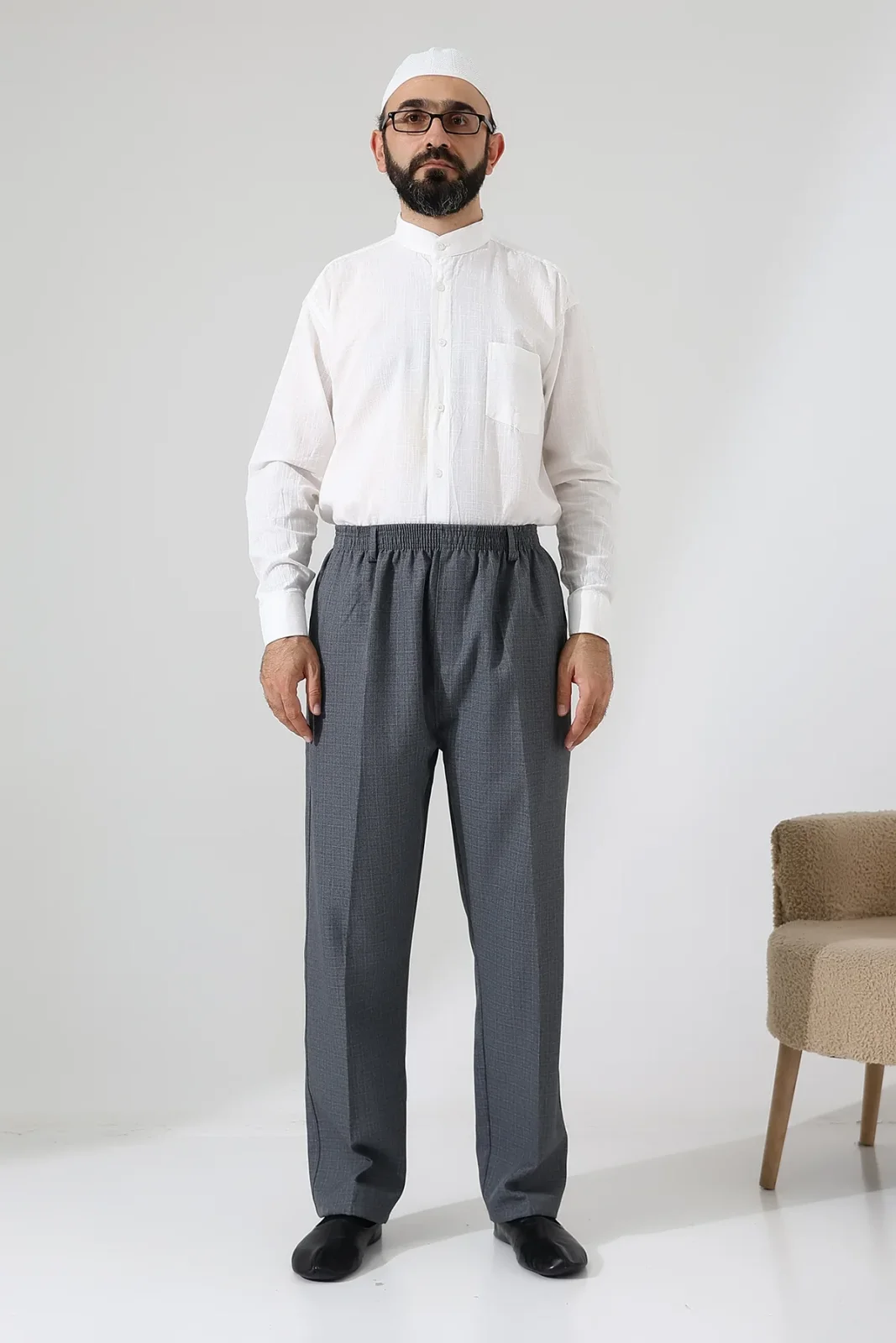 Erkek Hac Umre Graf Kareli Kumaş Pantolon, Beli Lastikli Cepli - Gri (ISR)