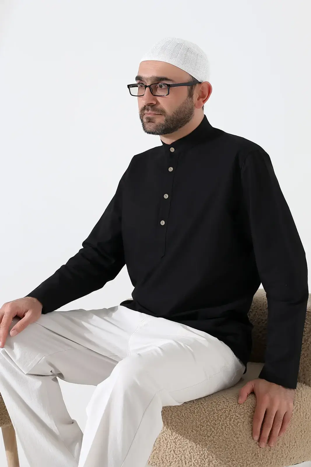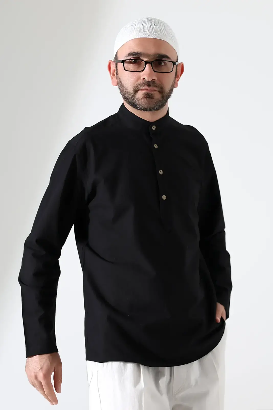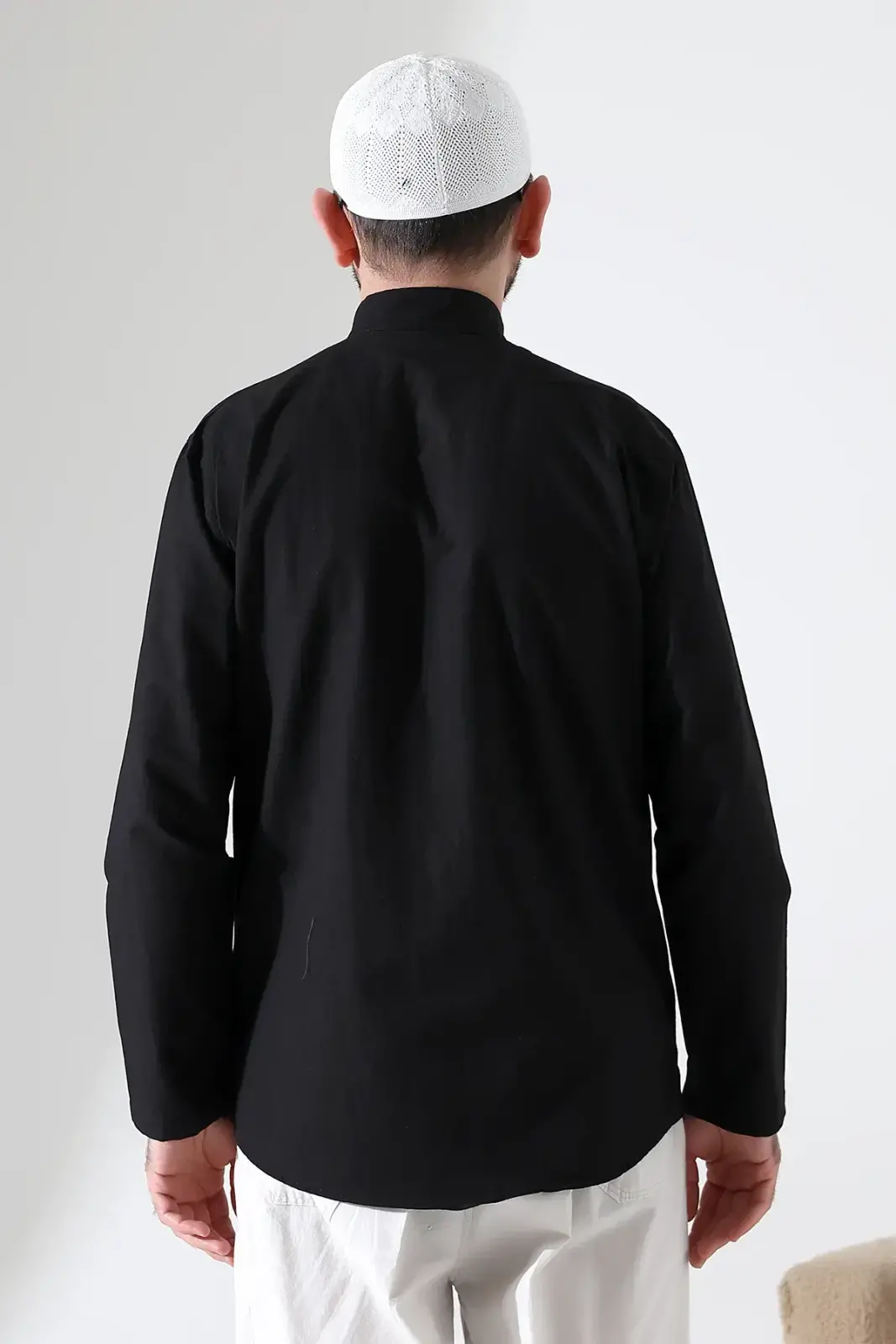 Erkek Hakim Yaka Uzun Kollu Düğmeli Keten Gömlek Siyah (Vşn)