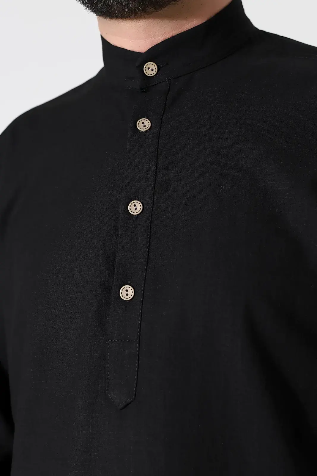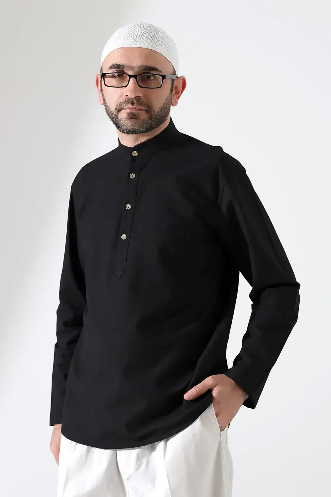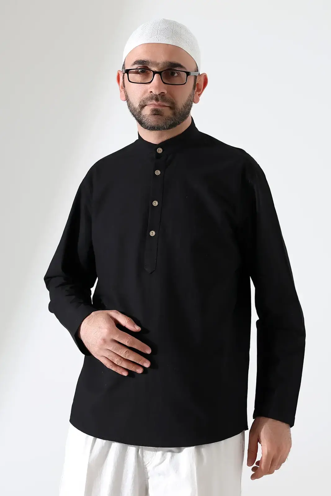 Erkek Hakim Yaka Uzun Kollu Düğmeli Keten Gömlek Siyah (Vşn)