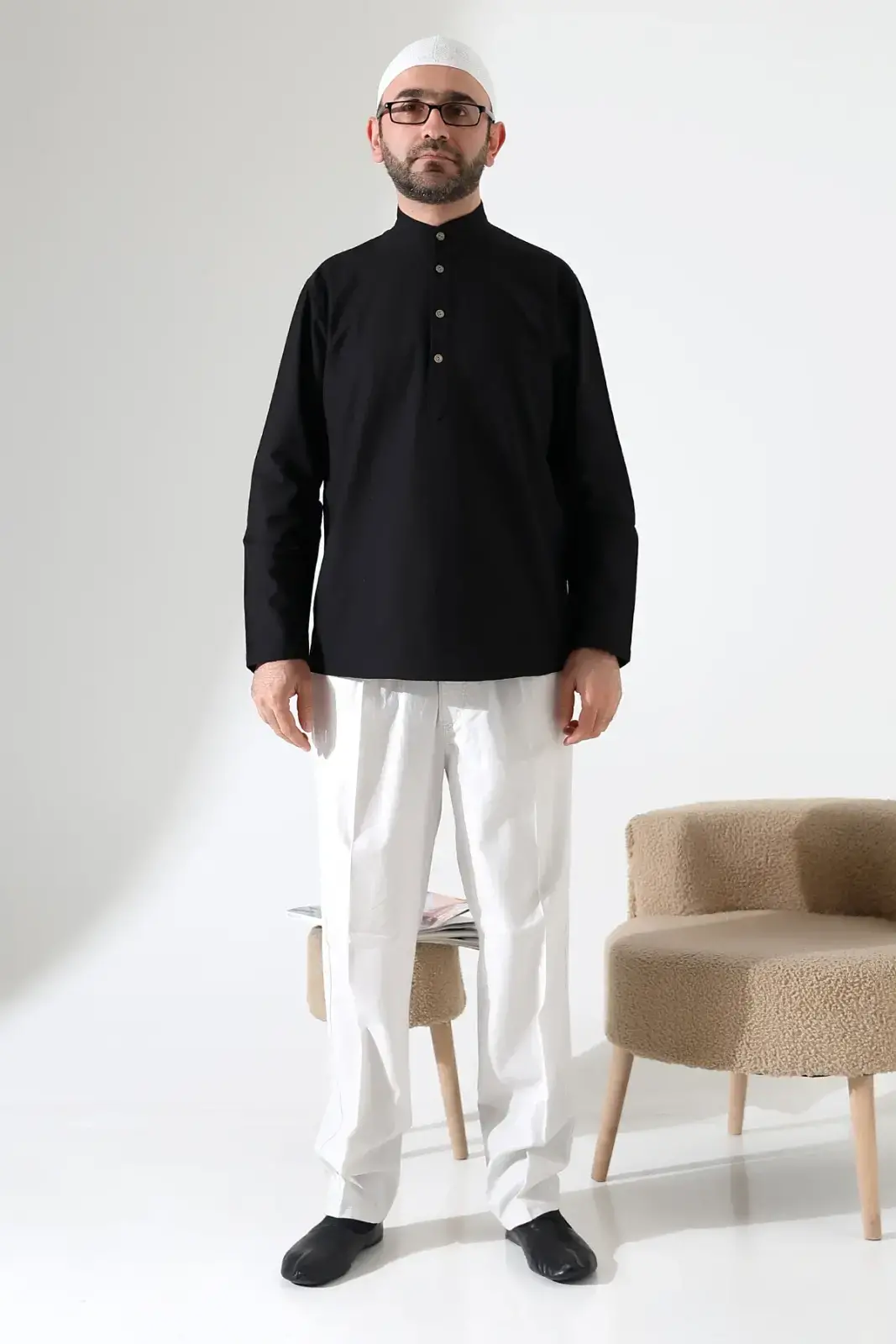 Yaz aylarında kullanım için idealdir. Vücut terini emme özelliğiyle daha hijyenik ve konforlu bir deneyim sunar. Nefes alabilen ve uzun ömürlü keten kumaşla üretilen bu gömlek, gün boyu süren rahatlık ve konfor sunar. Hakim yaka tasarımı, minimalist bir şıklık ve otantik bir hava yaratırken, zarif çizgilerle tasarımın öne çıkmasını sağlar. Hem günlük hayatta hem de Hac ve Umre ziyaretlerinizde rahatlıkla kullanabileceğiniz bu gömlek, konforu ve şıklığı bir arada sunar.