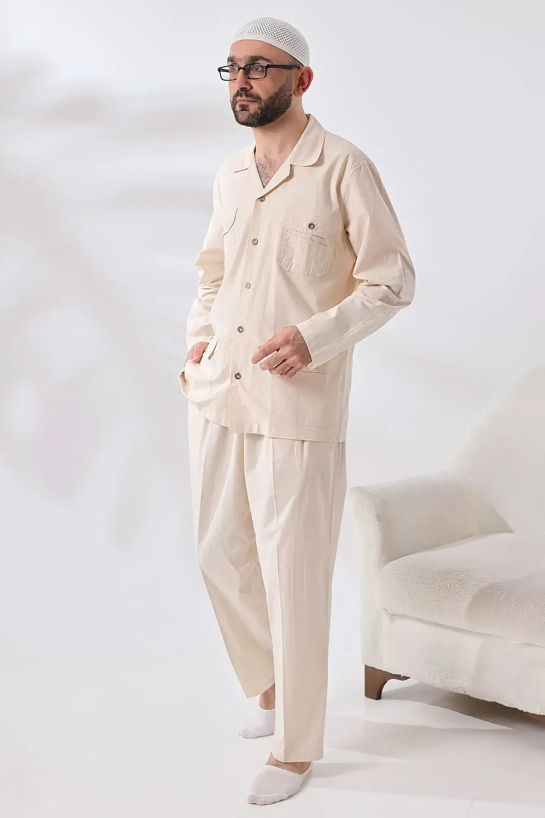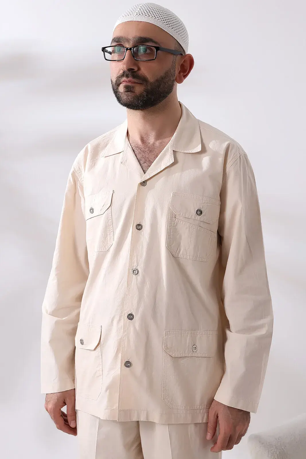 Erkek Keten 4 Cepli İkili Safari Takım Hac Umre Kıyafeti Krem