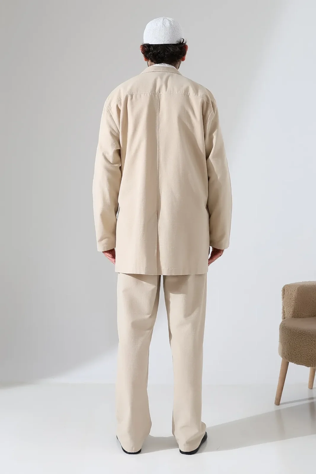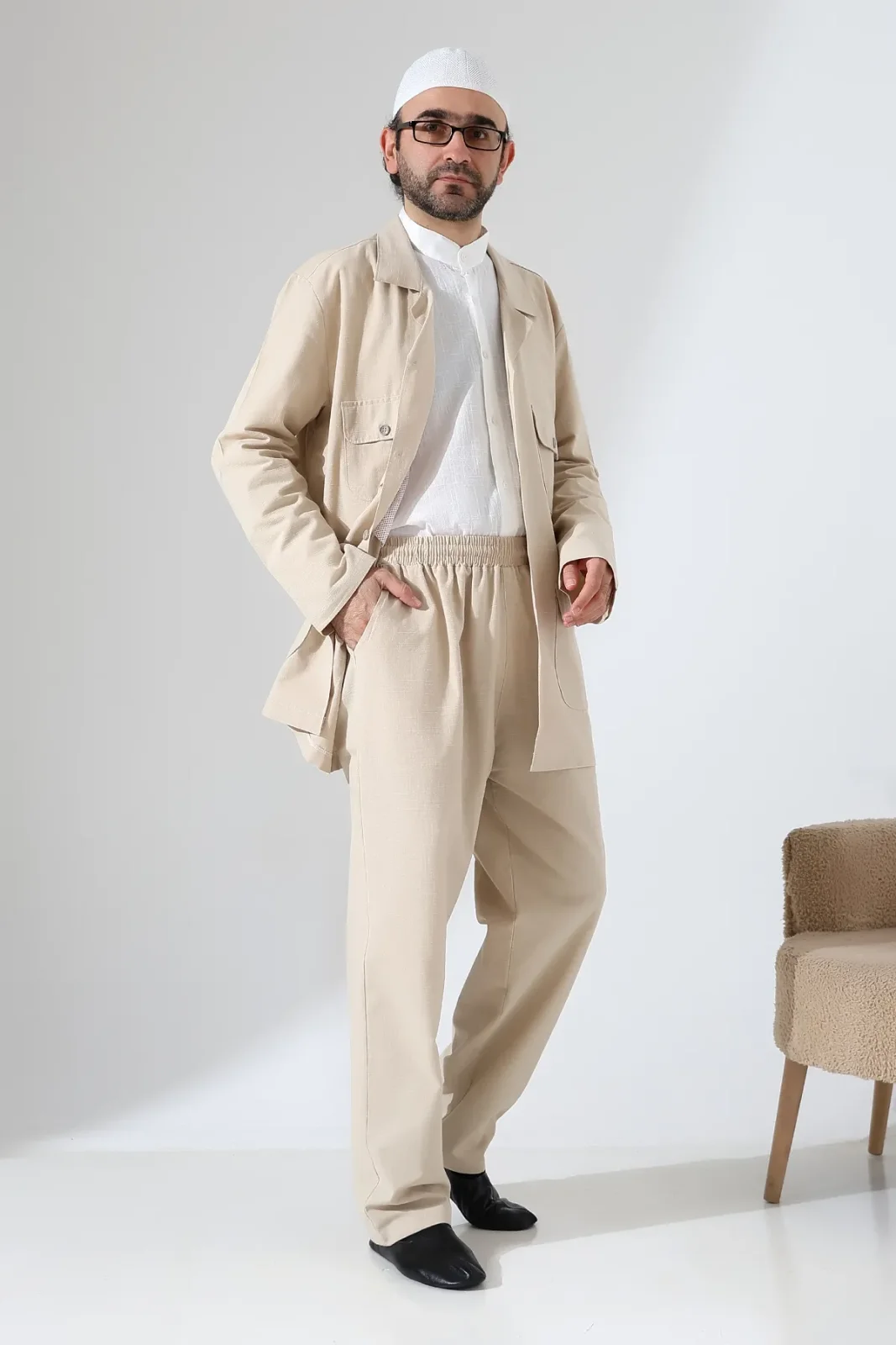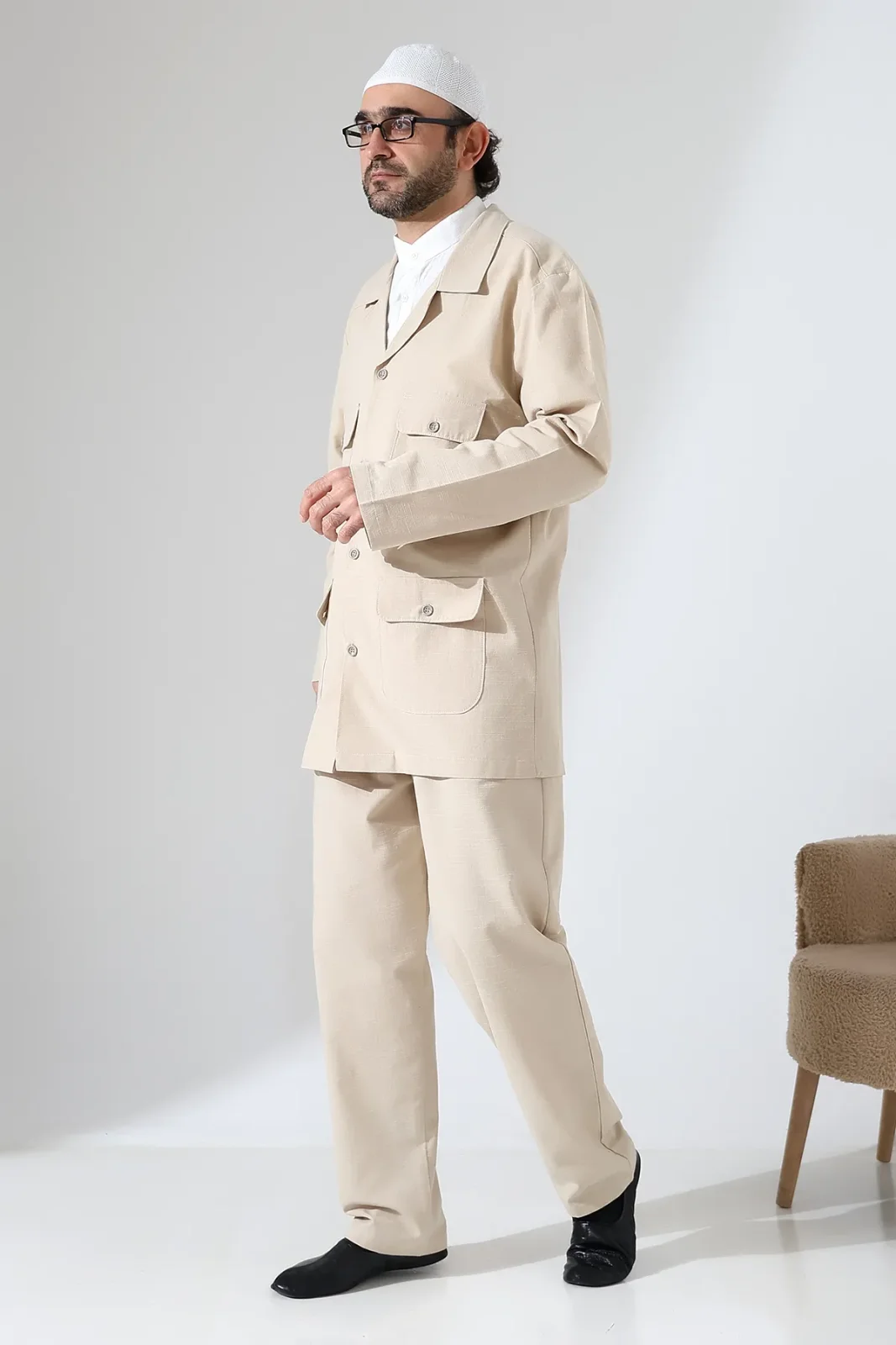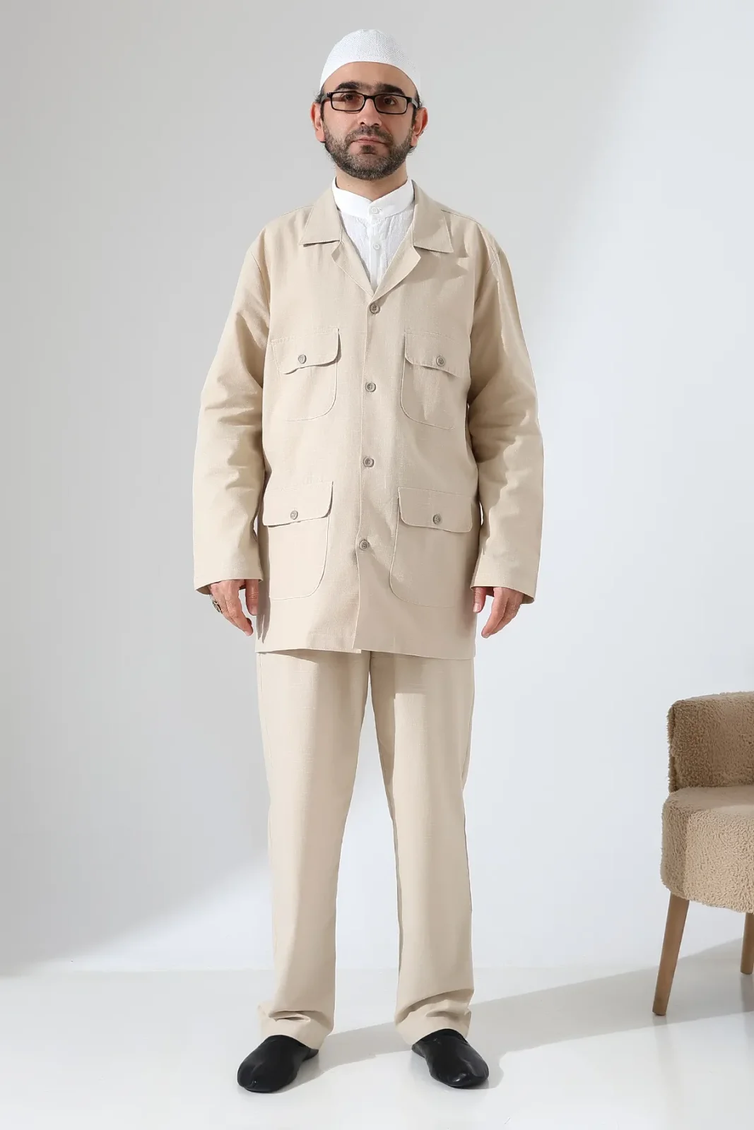 Bu şık ve konforlu erkek keten safari takım, sade zarafeti ve işlevselliğiyle Hac ve Umre yolculuklarında vazgeçilmeziniz olacak.