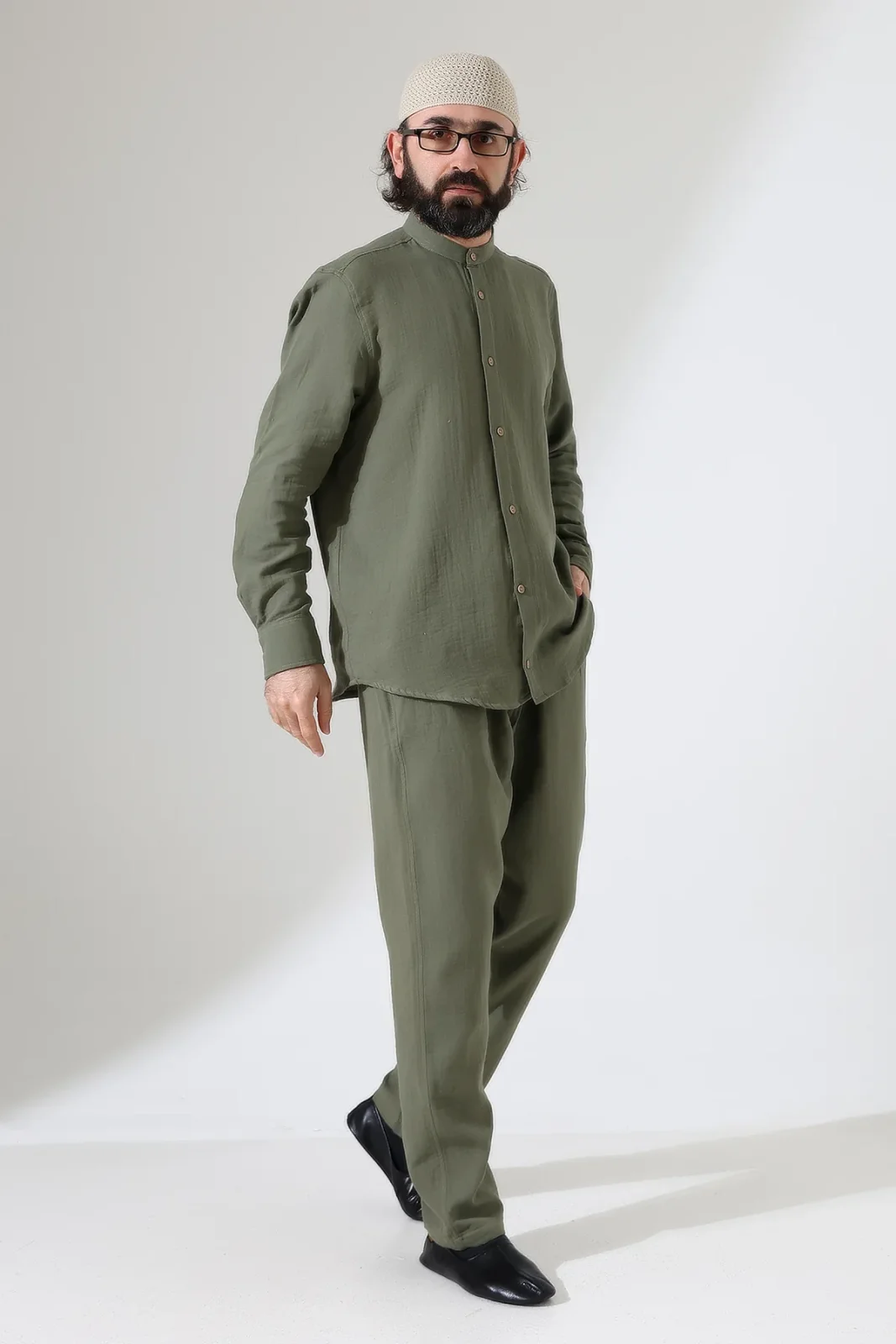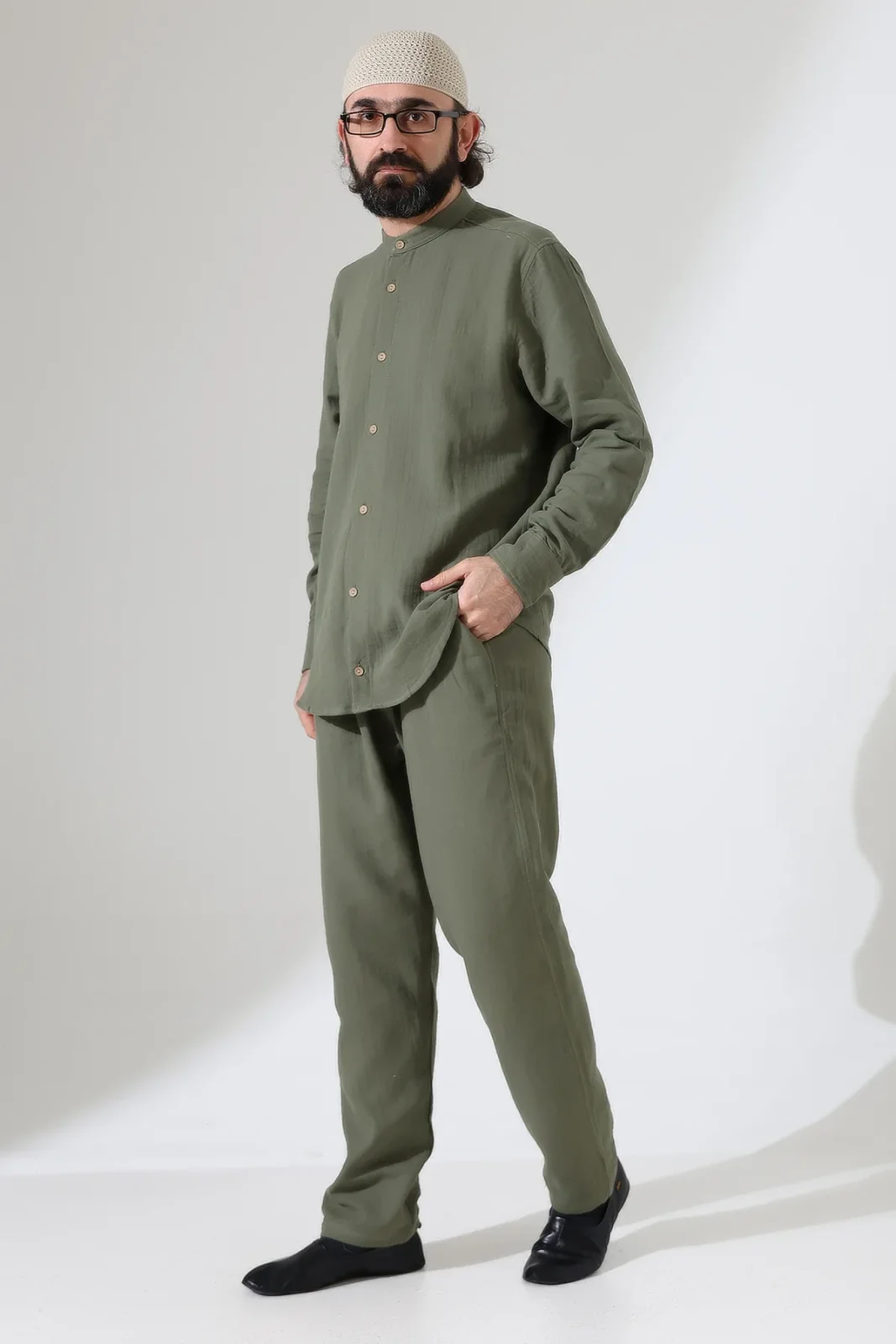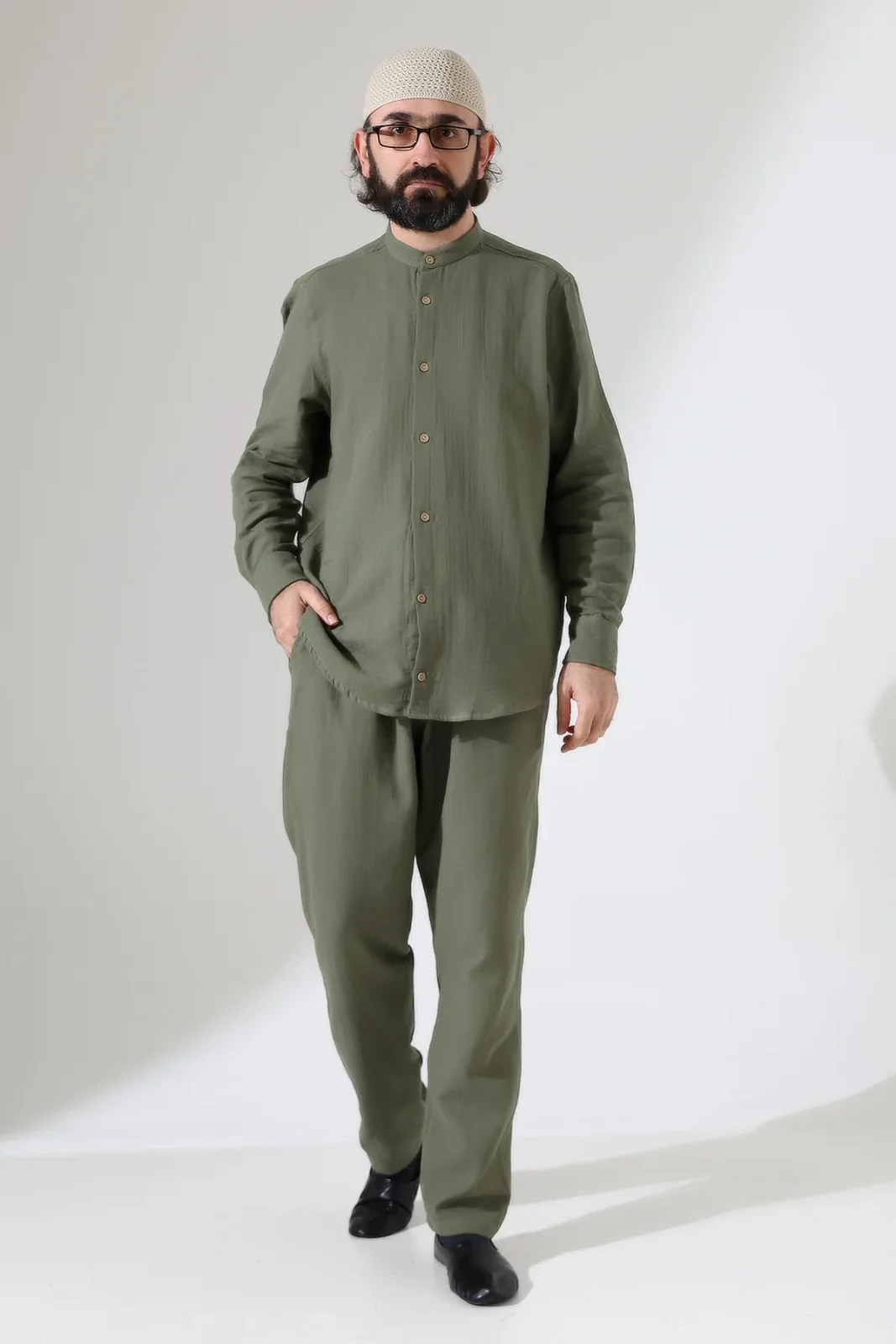 Erkek Müslin Hakim Yaka Gömlek Pantolon İkili Takım, Modern Hac Umre Kıyafeti - Haki Yeşil (VŞN)