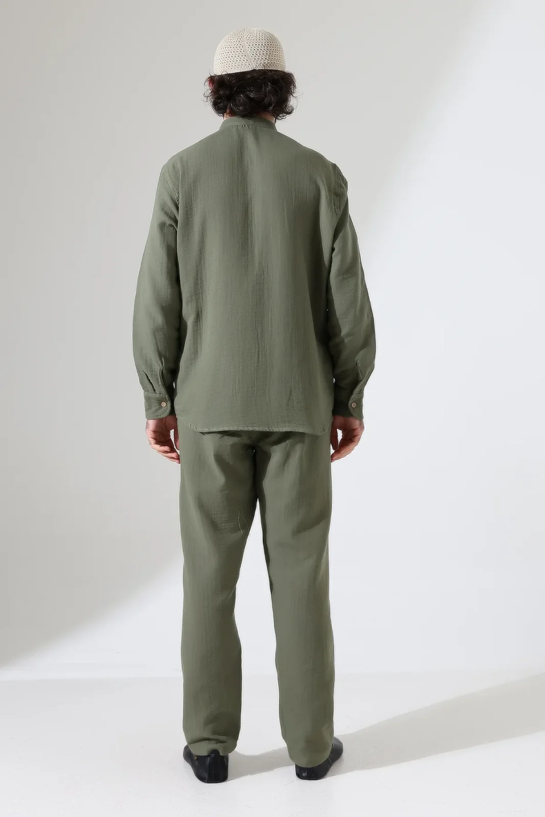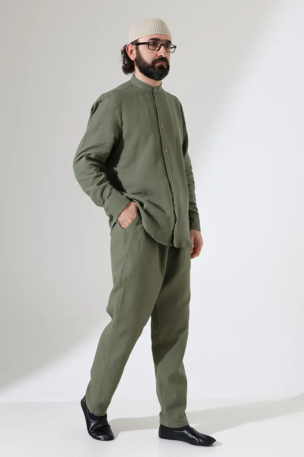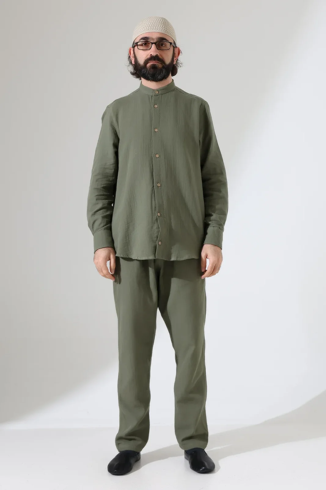 Erkek Müslin Hakim Yaka Gömlek Pantolon İkili Takım, Modern Hac Umre Kıyafeti - Haki Yeşil (VŞN)