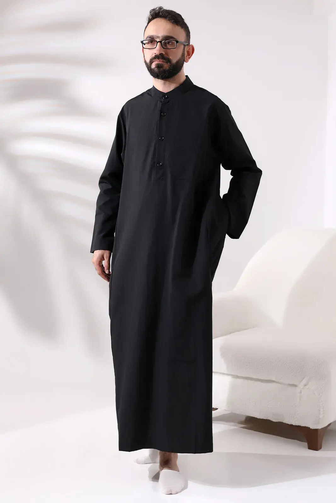 With its cotton viscose fabric and loose fit, it offers comfort and elegance both during religious worship and daily use. While its black color complements its traditional appearance, its material and cutting features increase functionality.