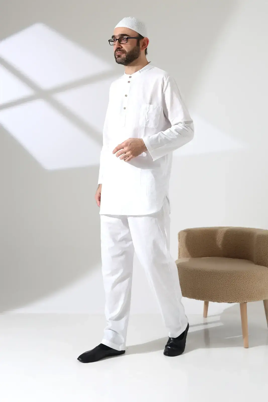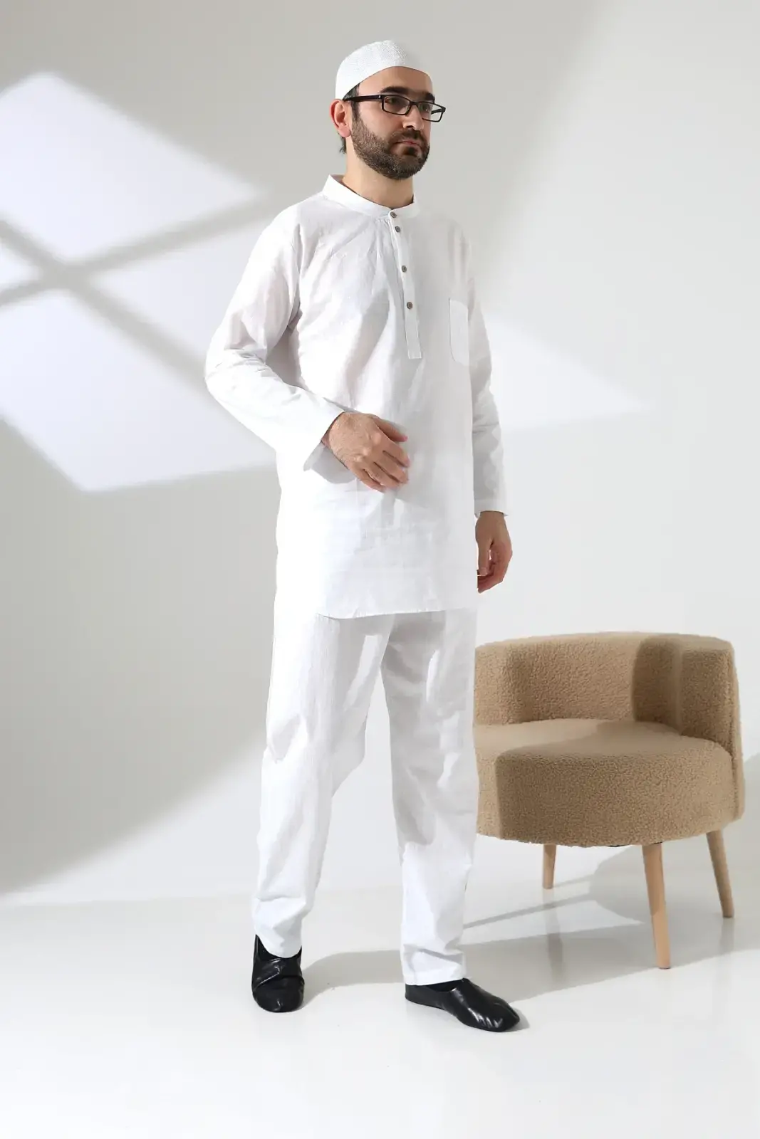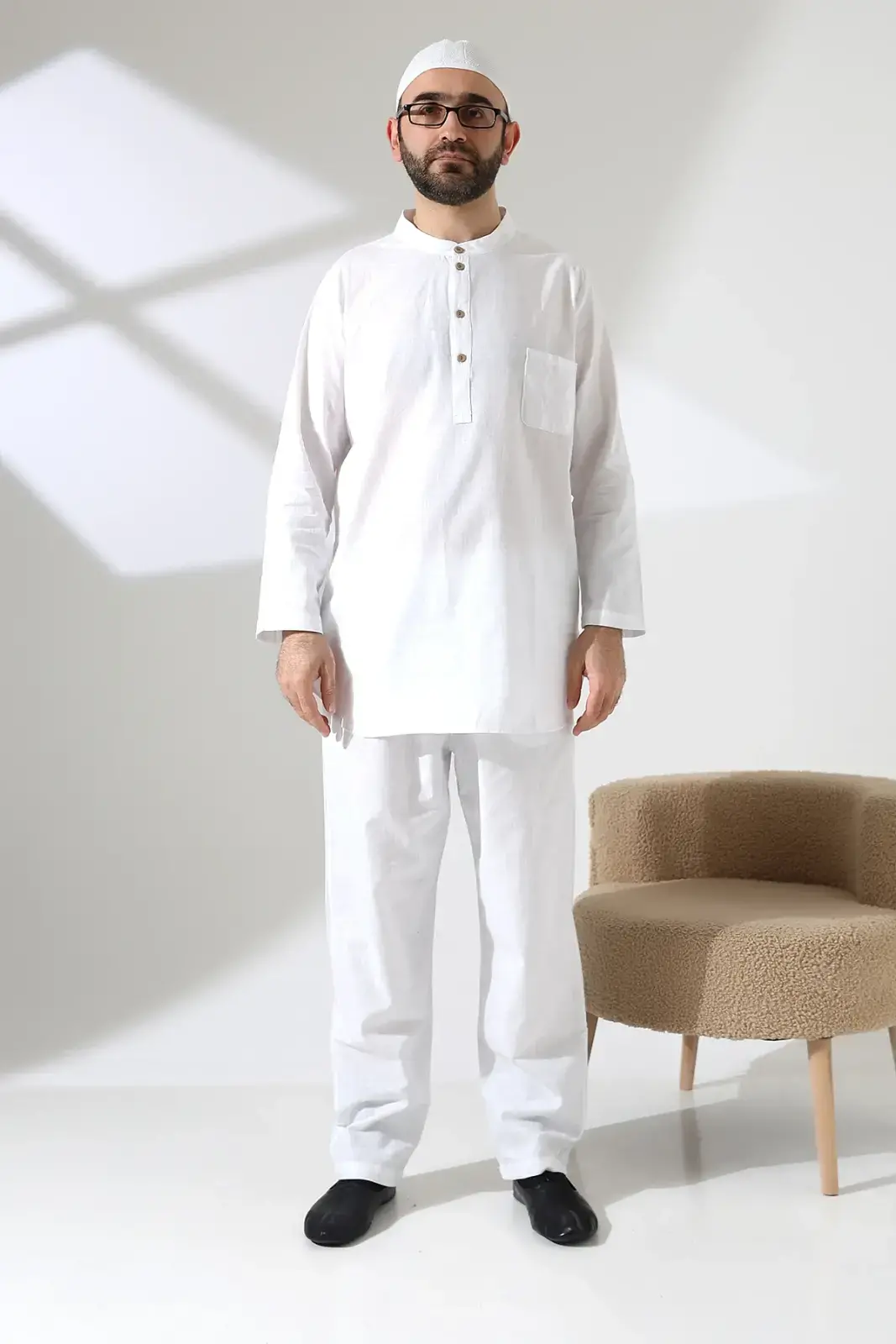 Hac, umre ve ibadetleriniz sırasında rahatlıkla kullanabileceğiniz bu takım, şık ve aynı zamanda sade tasarımıyla ibadetlerinizi huzur içinde gerçekleştirmenizi sağlar. Hafif ve nefes alabilir kumaşıyla hem uzun süreli kullanımda konfor sunar hem de günlük kullanıma uygundur.