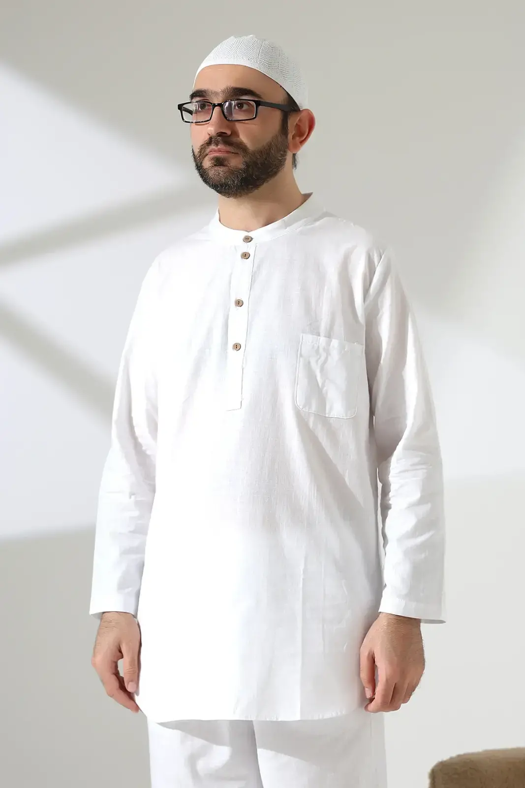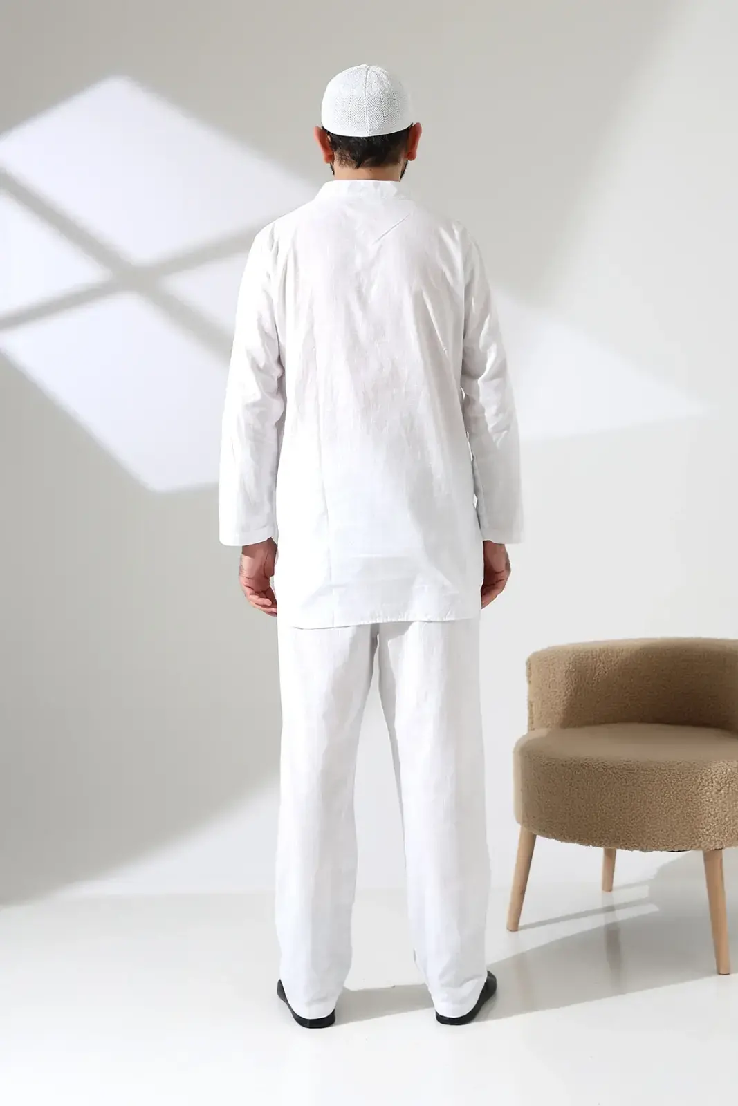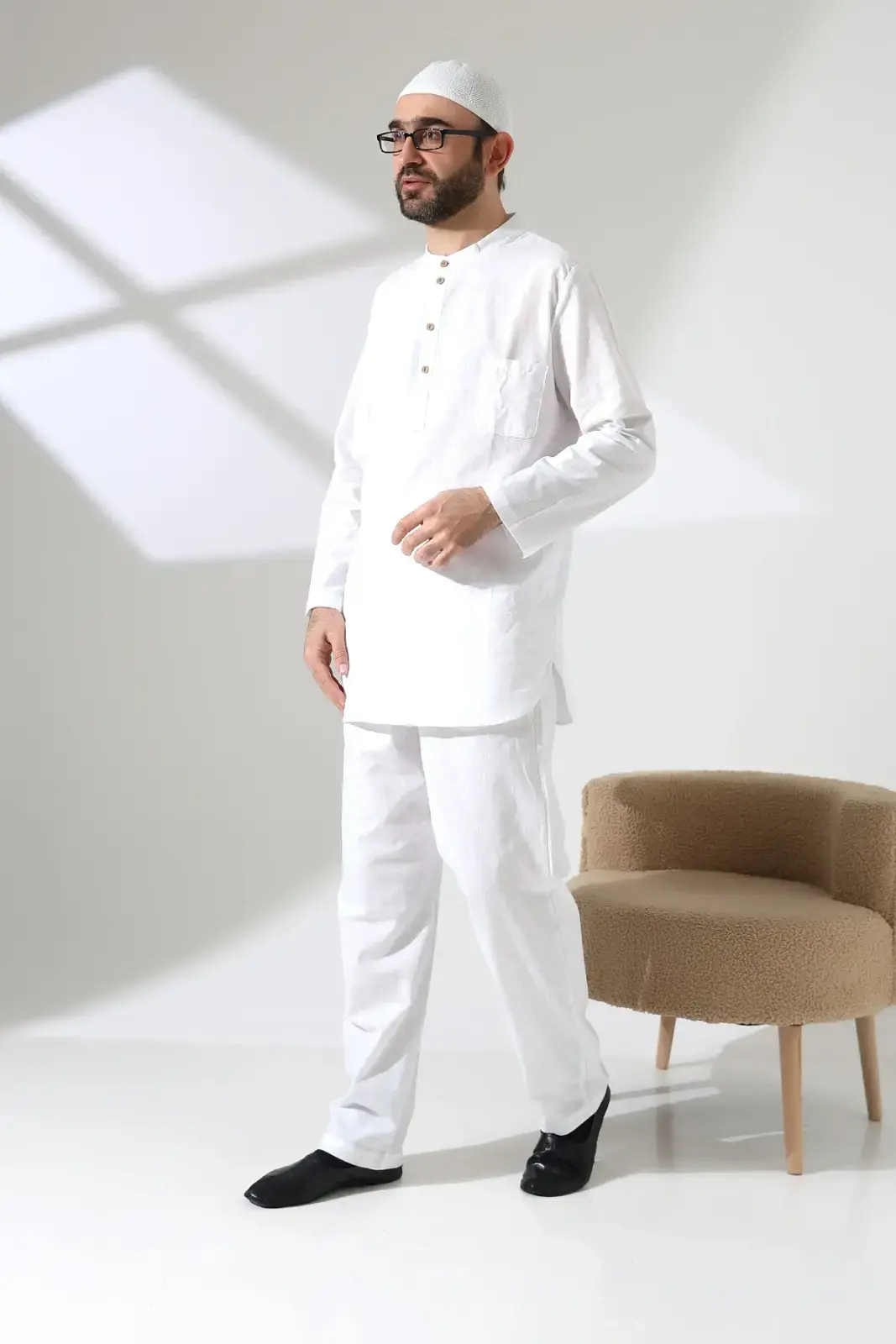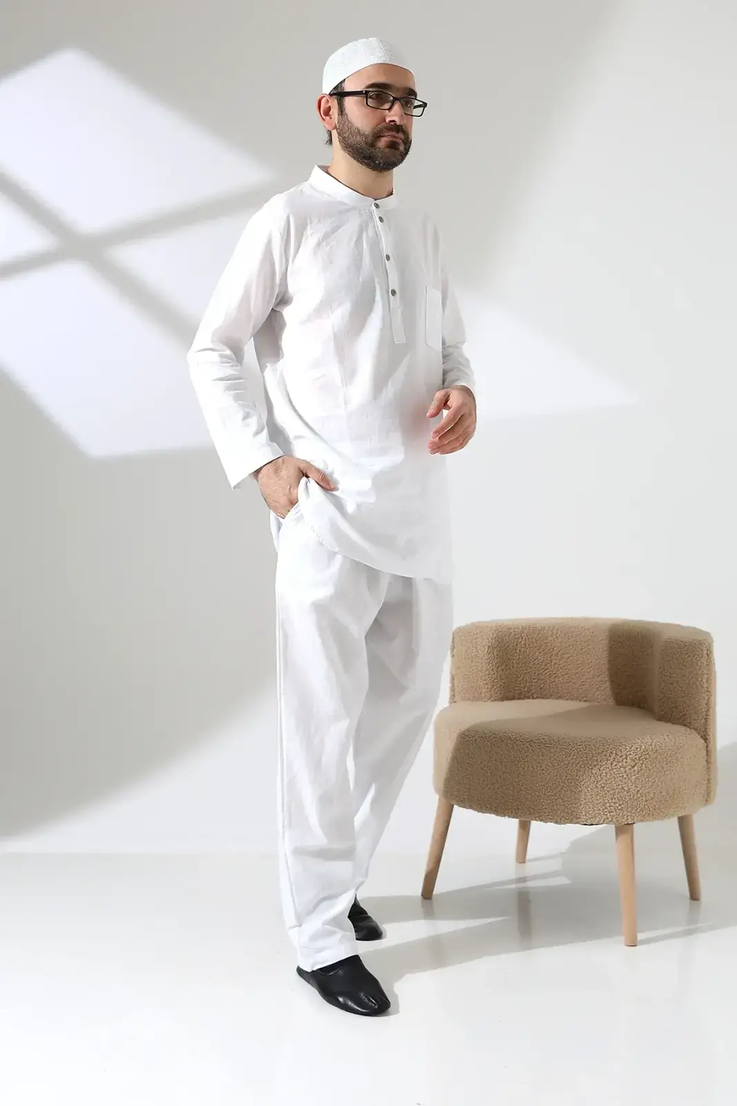 Hac, umre ve ibadetleriniz sırasında rahatlıkla kullanabileceğiniz bu takım, şık ve aynı zamanda sade tasarımıyla ibadetlerinizi huzur içinde gerçekleştirmenizi sağlar. Hafif ve nefes alabilir kumaşıyla hem uzun süreli kullanımda konfor sunar hem de günlük kullanıma uygundur.