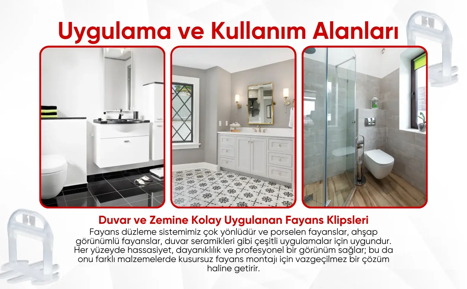 Bu klipsler, banyo, mutfak, teras gibi hem iç hem dış mekanlarda fayans döşerken büyük bir yardımcıdır. Farklı malzemelerde ve yüzeylerde rahatlıkla kullanabilirsiniz. Seramik, porselen ya da ahşap görünümlü fayanslarla mükemmel uyum sağlar.